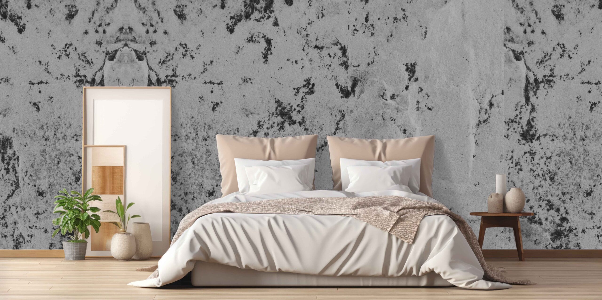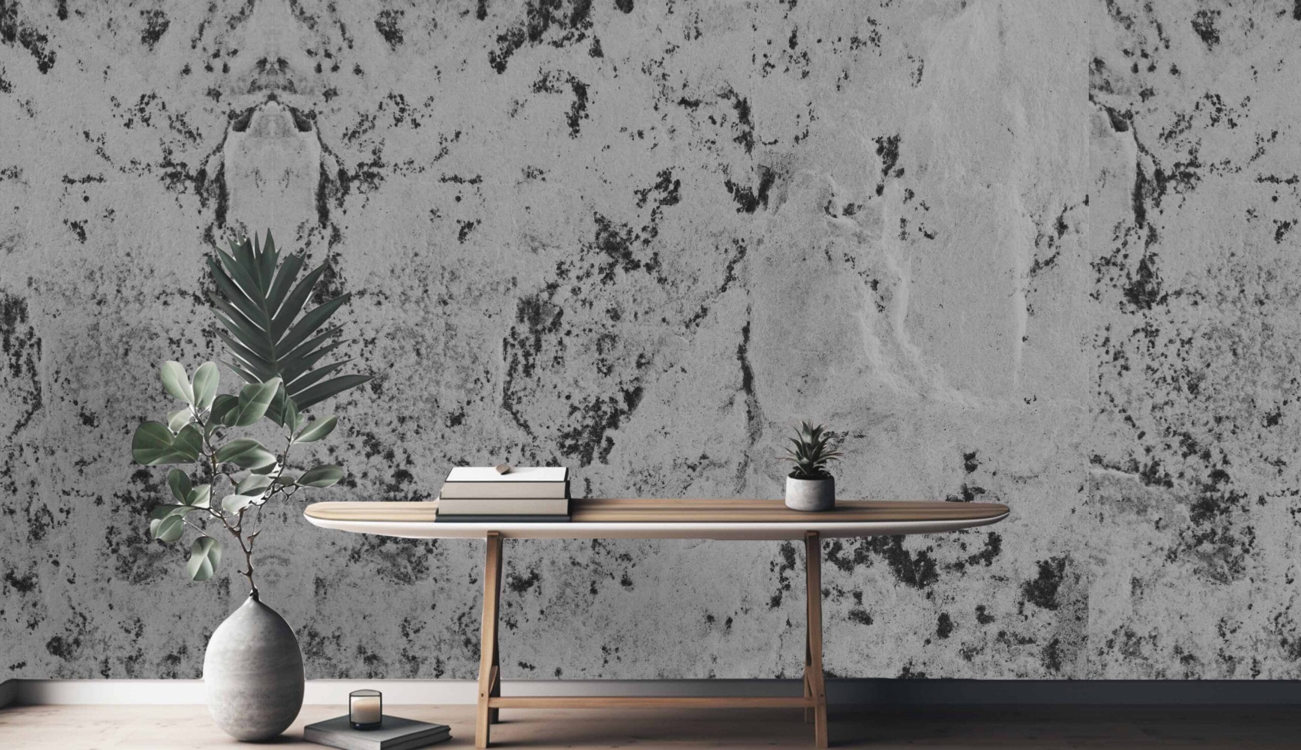 Tapeta Crno-bijela Patina donosi izražajnu teksturu istrošenog zida s crnim mrljama i efektom patine. Ova unikatna kombinacija kontrastnih tonova stvara snažan vizualni dojam i daje prostoru dozu karaktera.