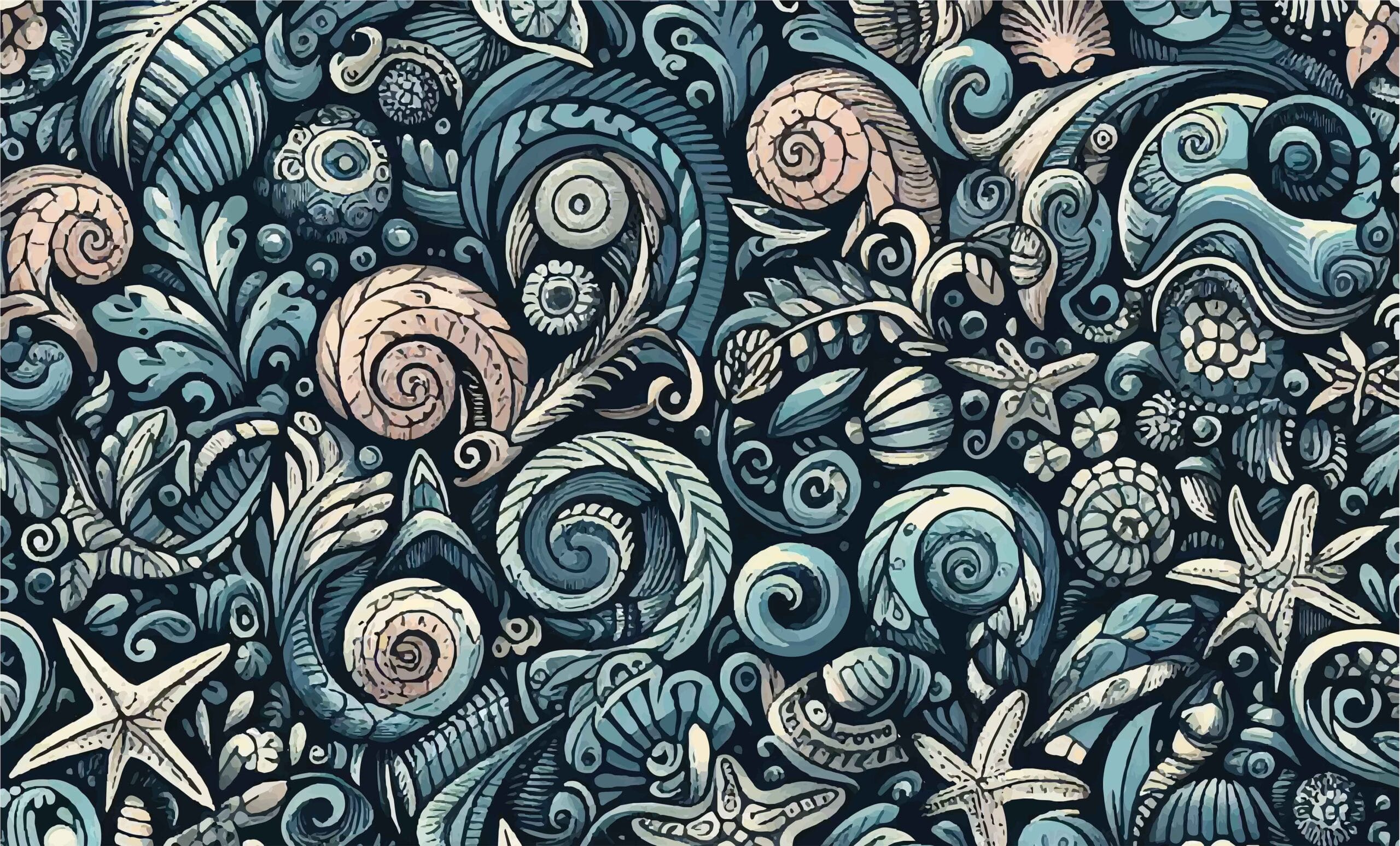 - Motiv: Apstraktni morski vrtlog s ljuskama, valovima i školjkama