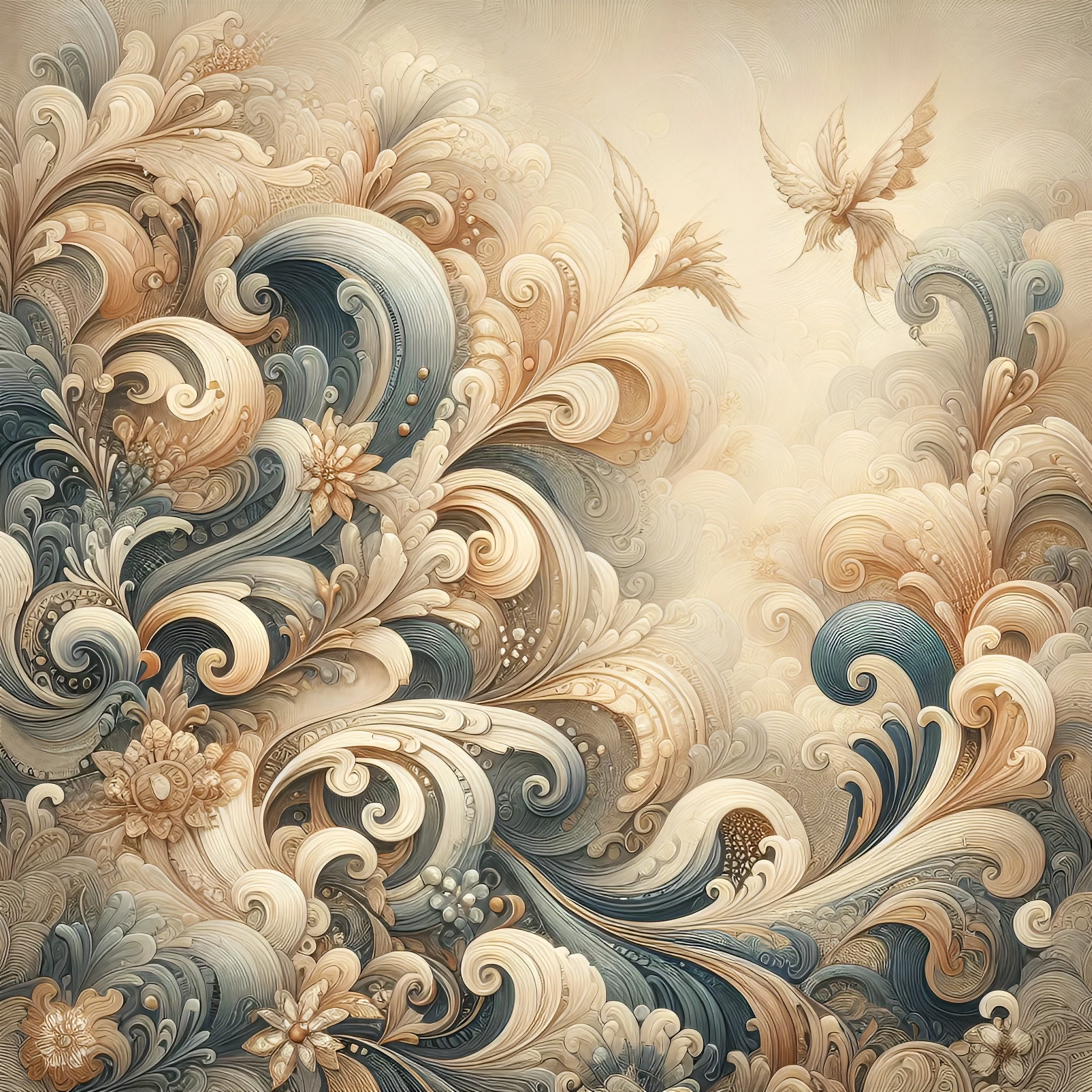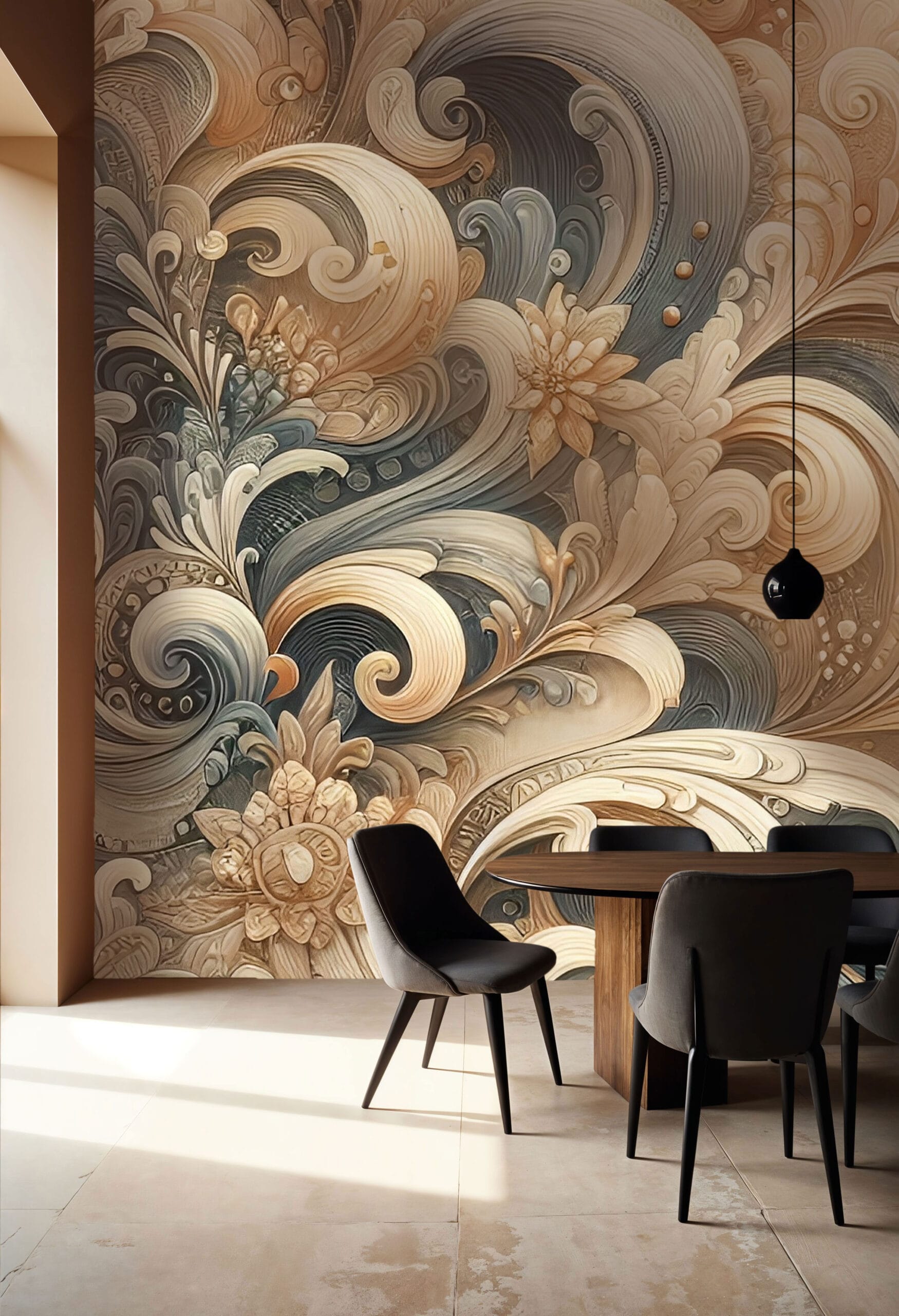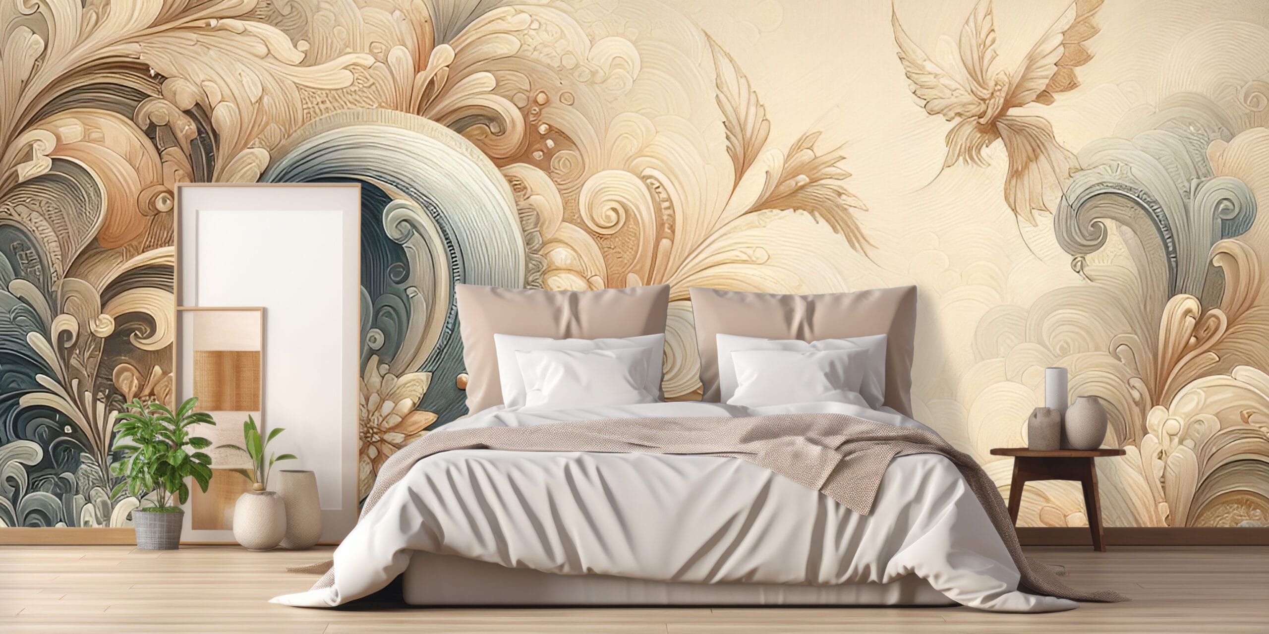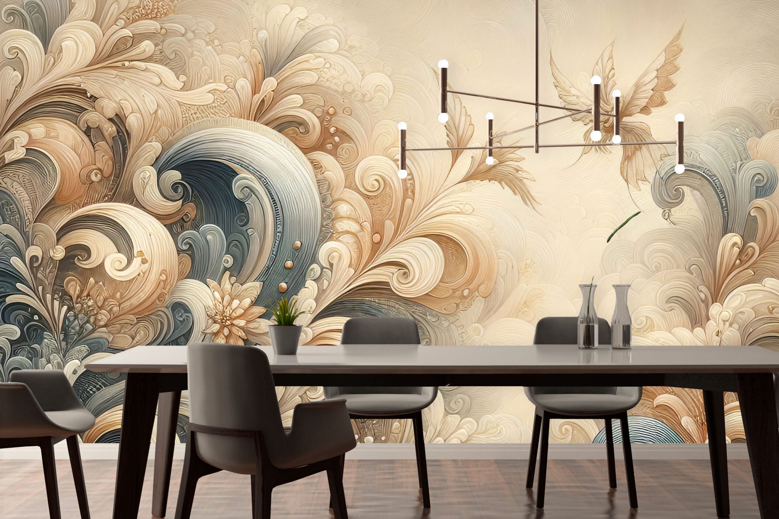 Tapeta Eterični Vrtlog unosi bezvremensku eleganciju i umjetničku dubinu u vaš prostor. Raskošni, vijugavi motivi inspirirani barokom, isprepleteni s nježnim cvijećem i pticom u letu, stvaraju dinamičnu, a istovremeno umirujuću atmosferu profinjenog luksuza.