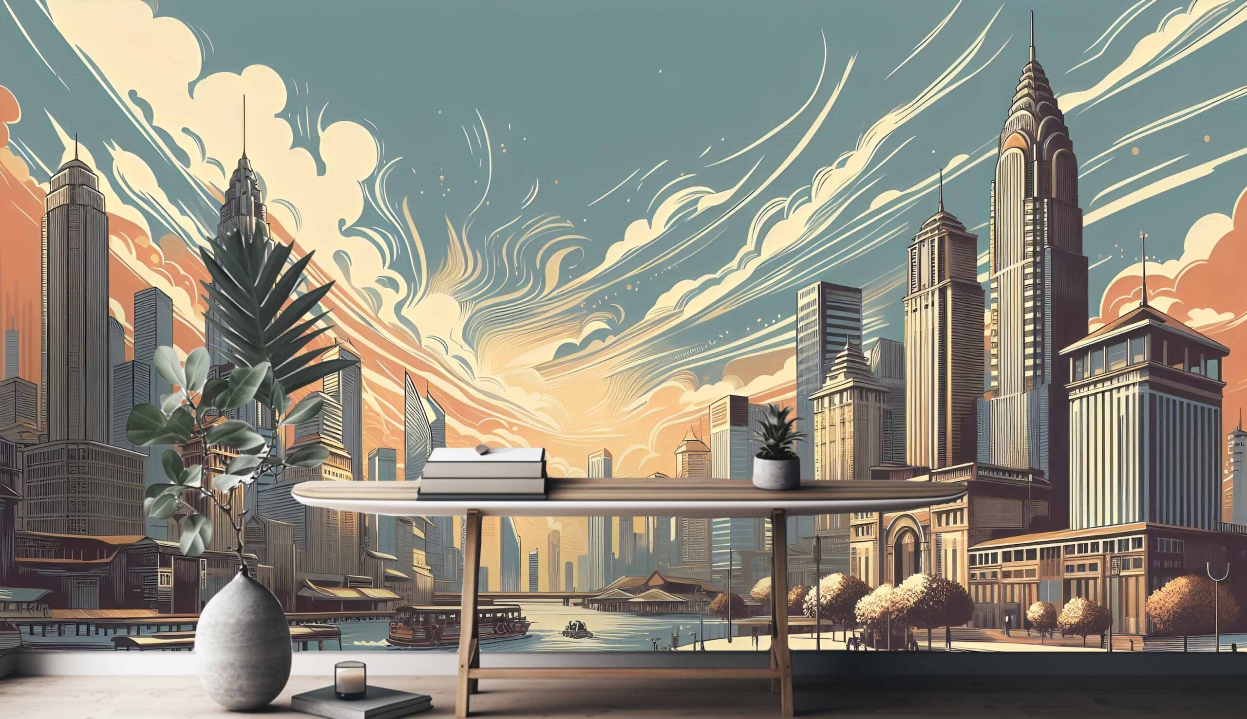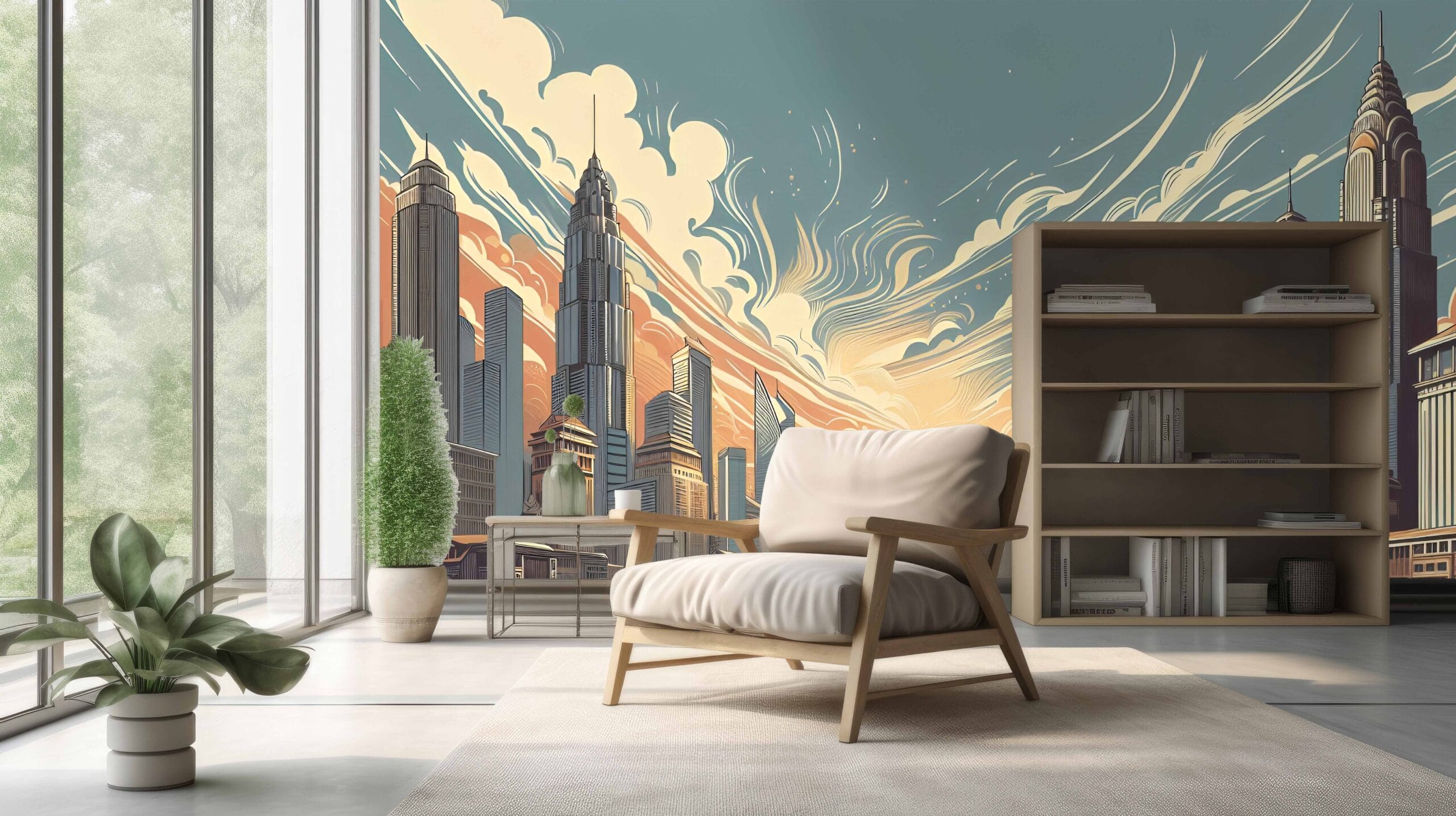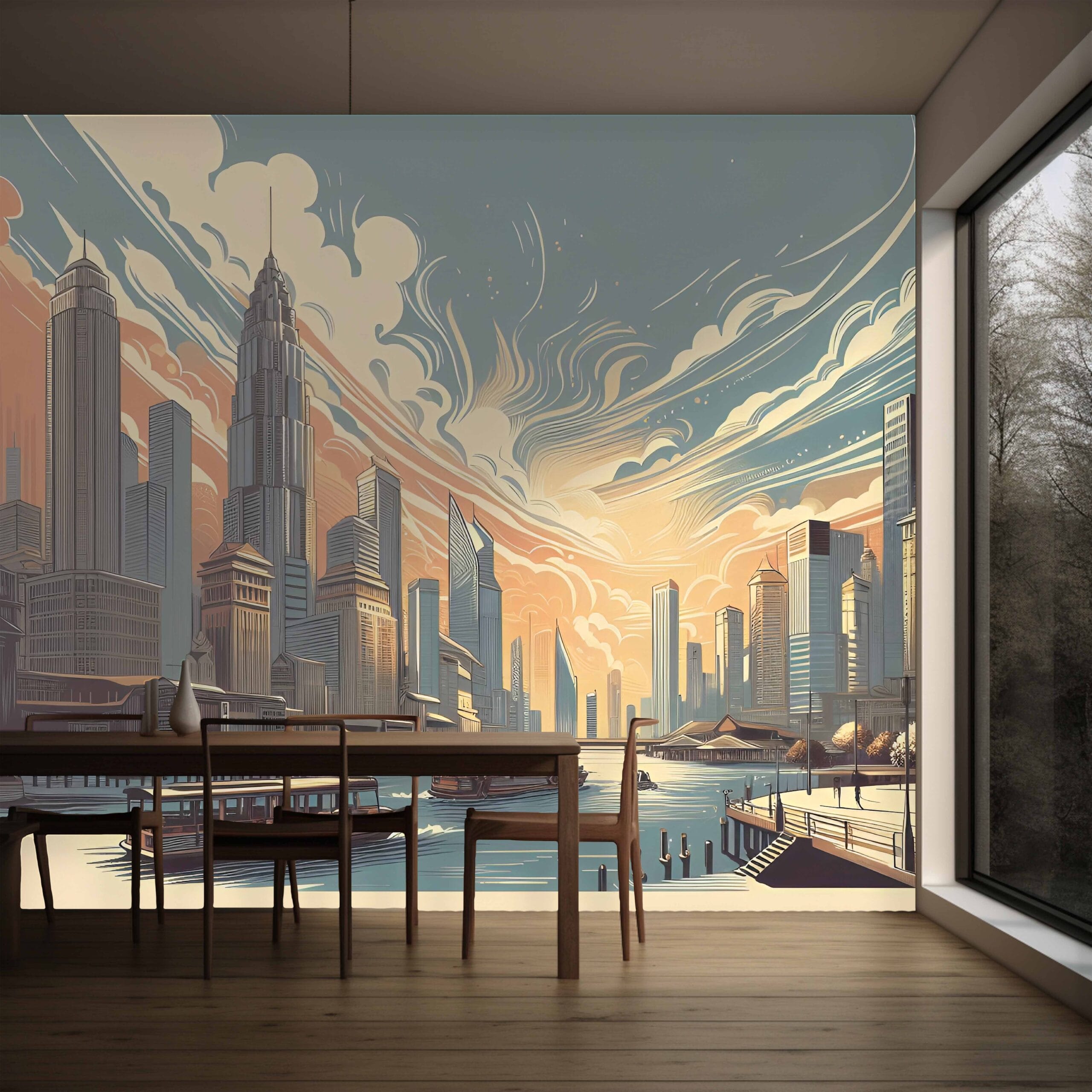 Unesite dozu futurizma i umjetničke energije u svoj prostor s tapetom Futuristički Horizont. Ova upečatljiva ilustracija prikazuje metropolu visokih nebodera obasjanu nebeskim svjetlosnim valovima, stvarajući osjećaj pokreta i suvremenog dizajna. Savršena je za one koji žele zid pretvoriti u vizualni spektakl inspiriran estetikom retro-futurizma.
