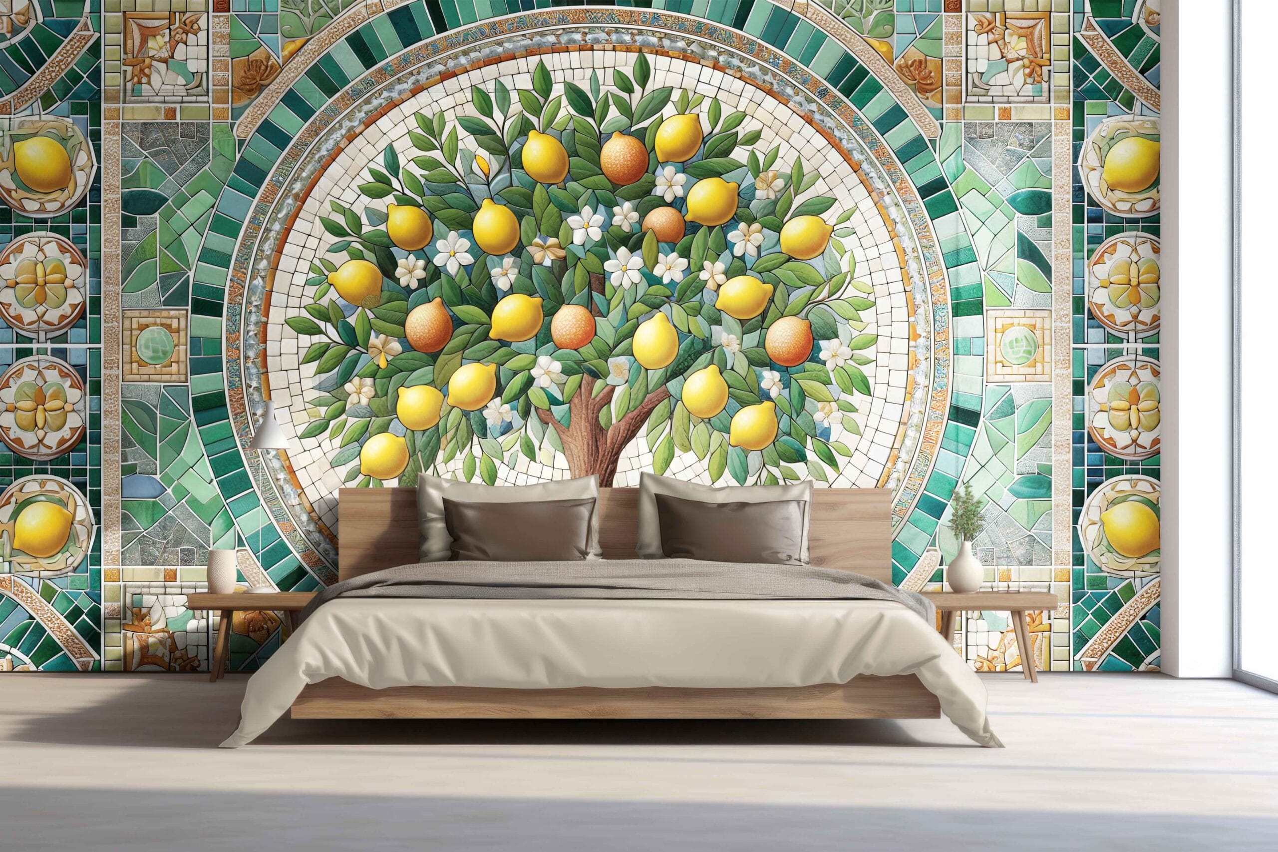 Unesite toplinu i duh Mediterana u svoj dom s tapetom Mediteranski Mozaik. Ovaj raskošni dizajn inspiriran je talijanskim i španjolskim mozaicima te prikazuje bogato limunovo stablo okruženo elegantnim keramičkim uzorcima. Kombinacija vibrantne žute, bogate zelene i zemljanih tonova stvara bezvremenski izgled koji unosi svježinu i karakter u svaki prostor.