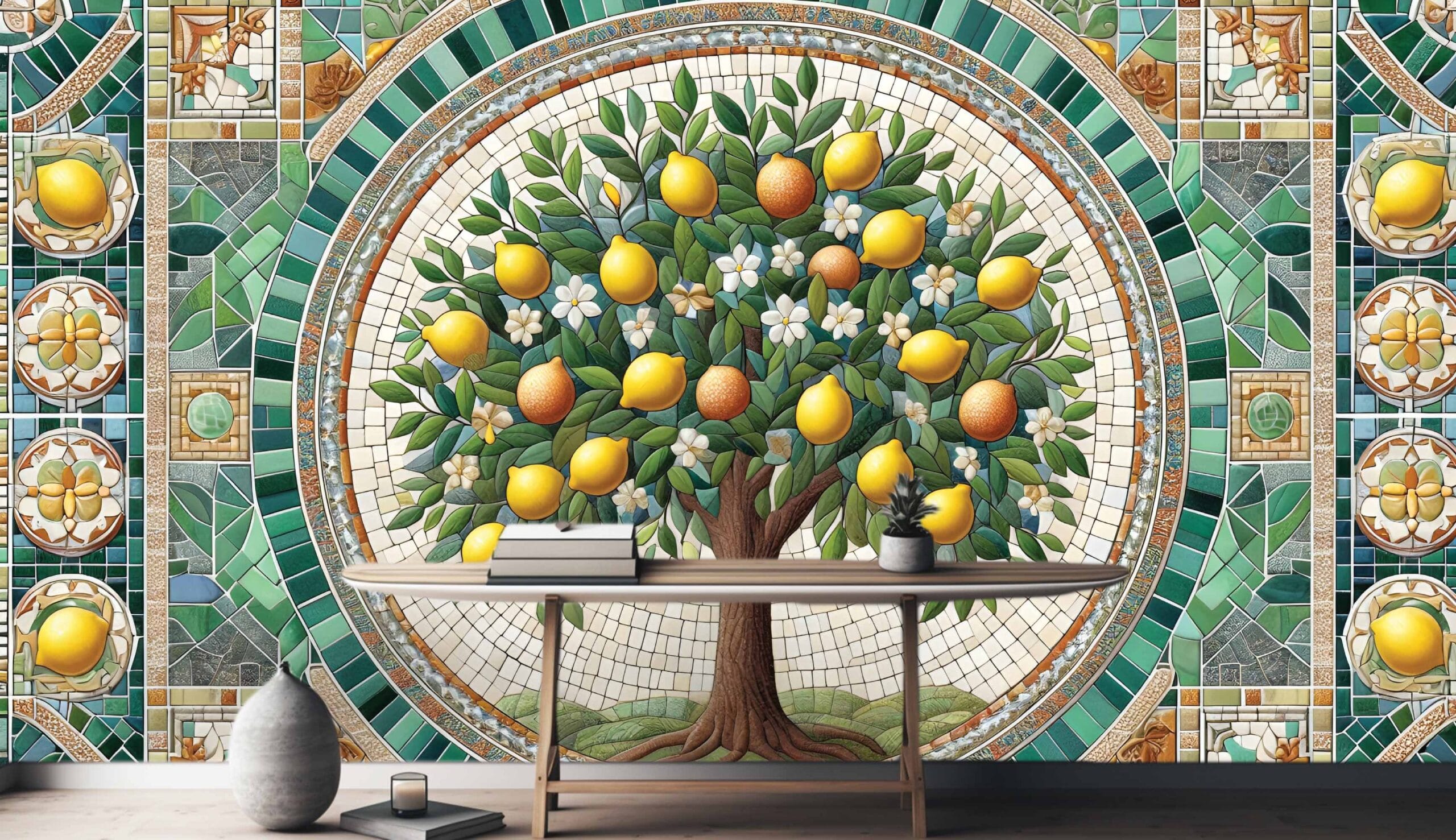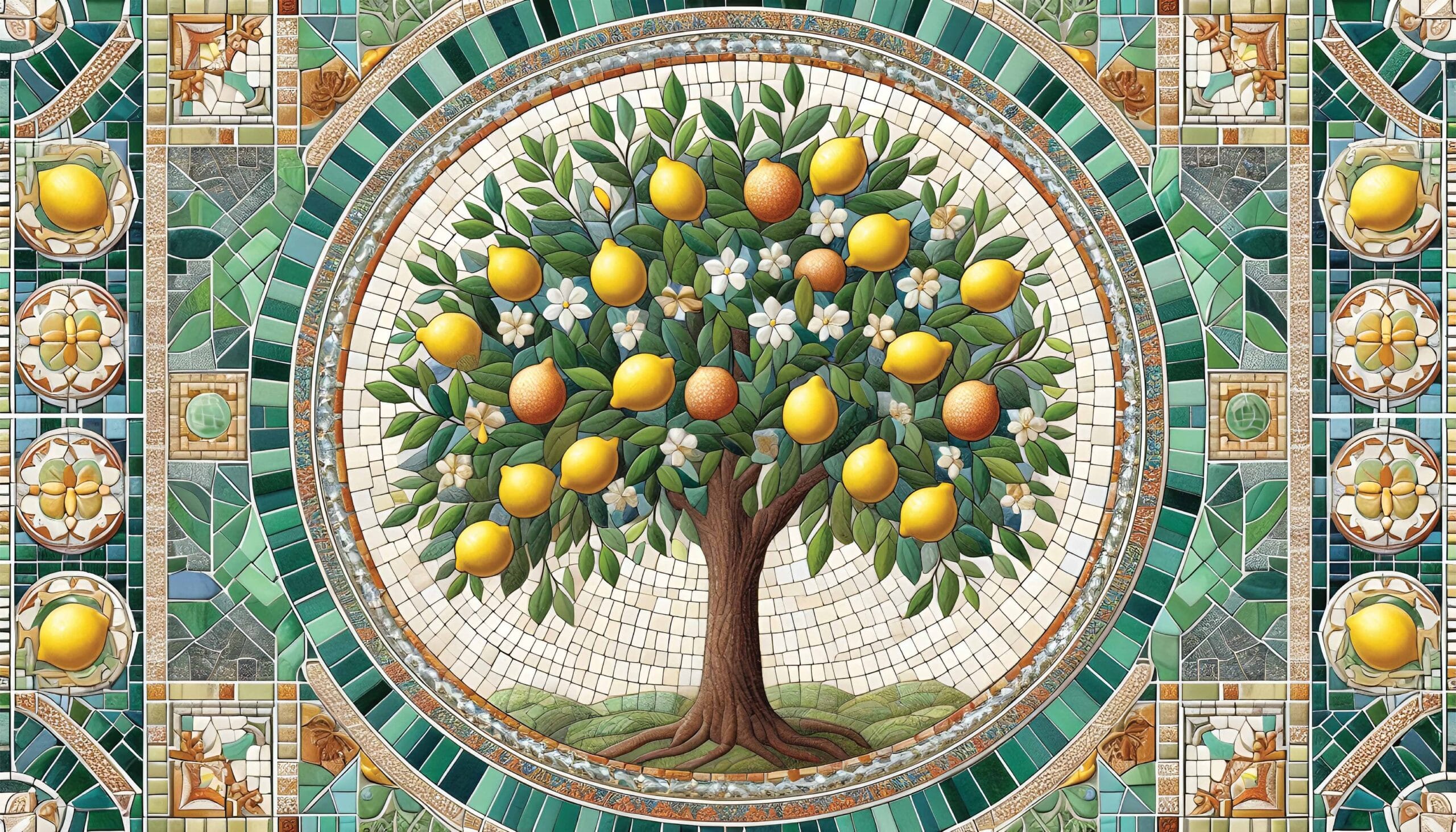 - Motiv: Mozaik s limunovim stablom i tradicionalnim uzorcima