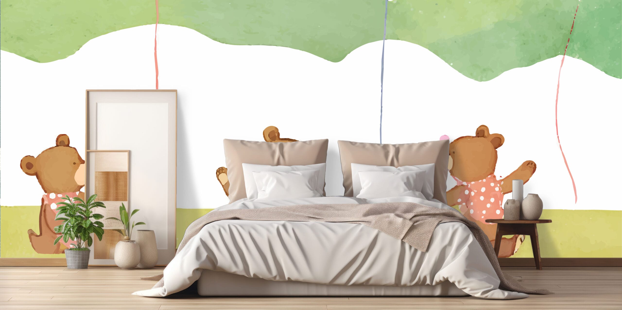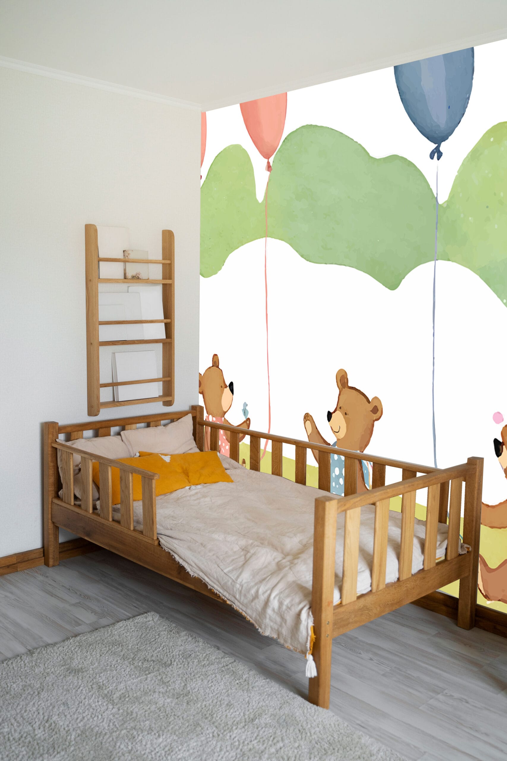Tapeta Medvjedići s Balonima unosi čistu radost i nježnost u dječji prostor. Simpatični smeđi medvjedići koji se igraju s balonima na bijeloj podlozi stvaraju prozračan i veseo ambijent. Nježni akvarel stil i pastelni tonovi čine ovu tapetu idealnim izborom za sobe u kojima želite postići osmijeh i miran san vaših mališana.