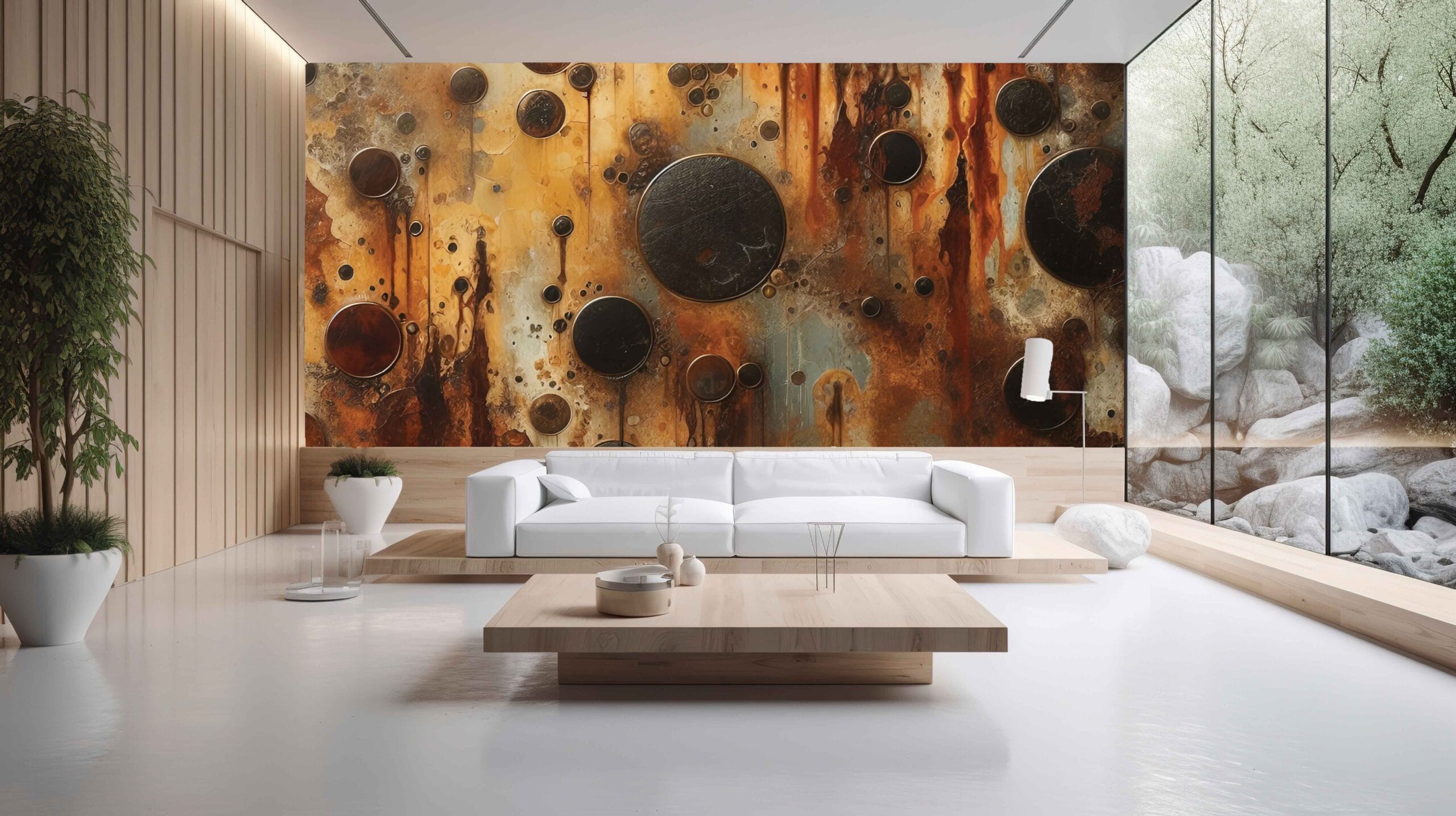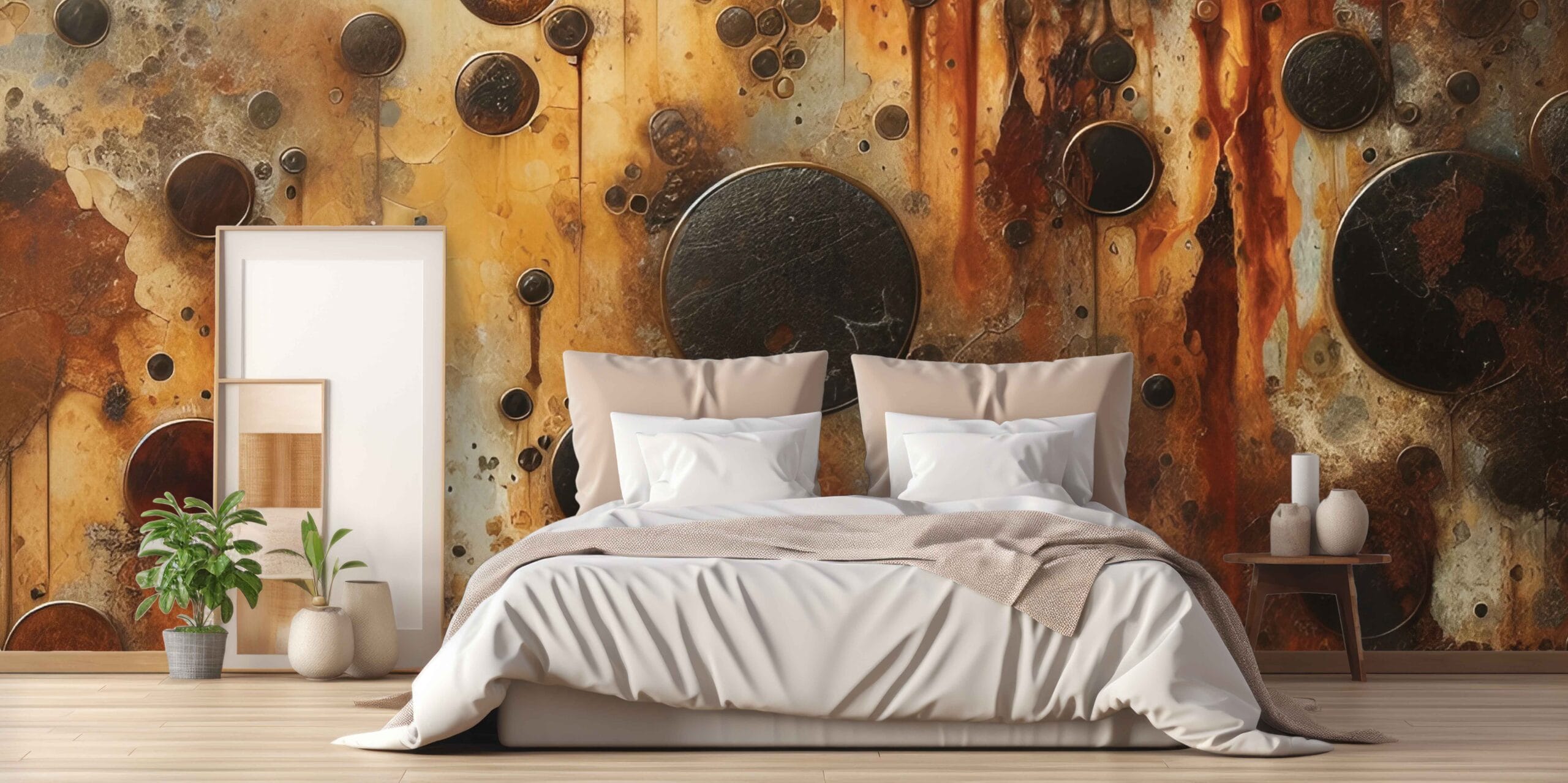 Dodajte snažan karakter svom interijeru s tapetom Metalna Apstrakcija u Hrđavim Tonovima. Ova umjetnička kompozicija metalnih krugova i hrđavih tragova donosi sirovu industrijsku estetiku u vaš prostor. Idealna je za one koji vole odvažne dizajnerske elemente i žele naglasiti jedinstven vizualni identitet svog doma ili poslovnog prostora.