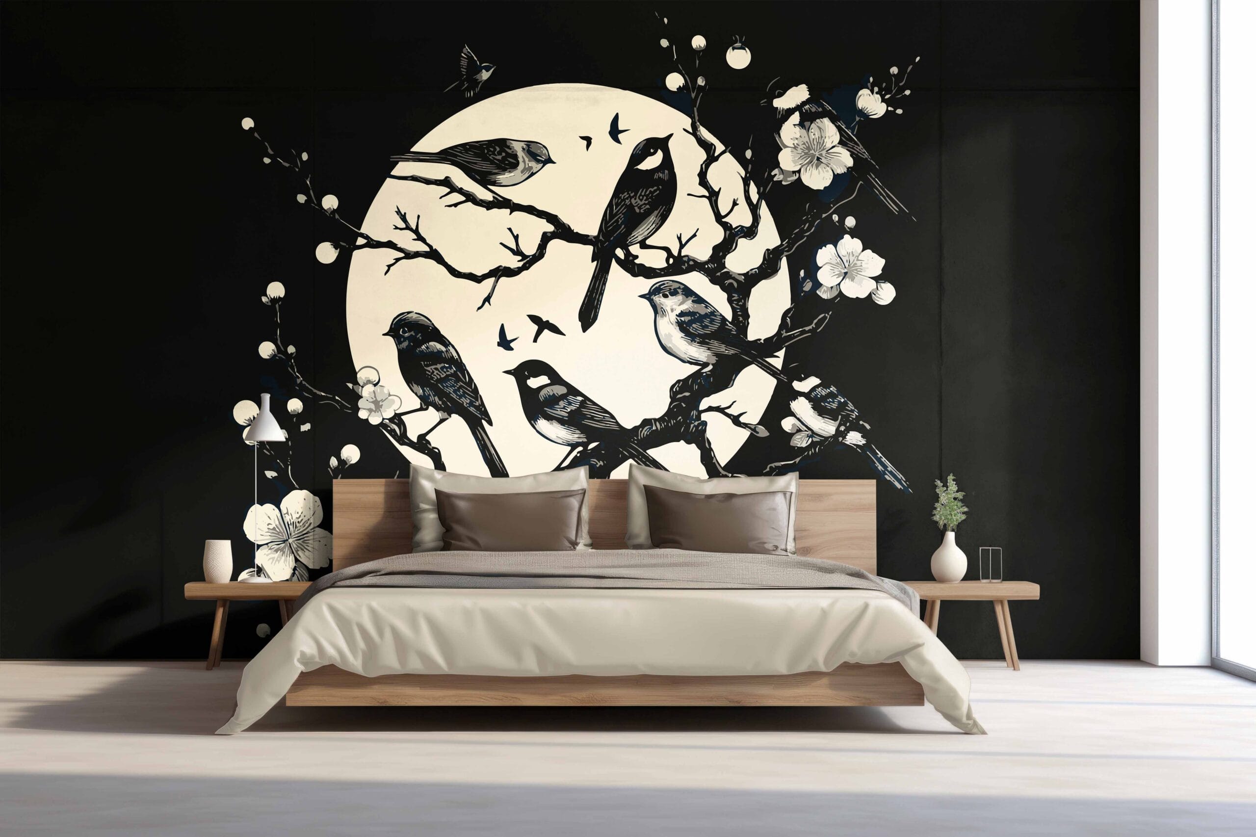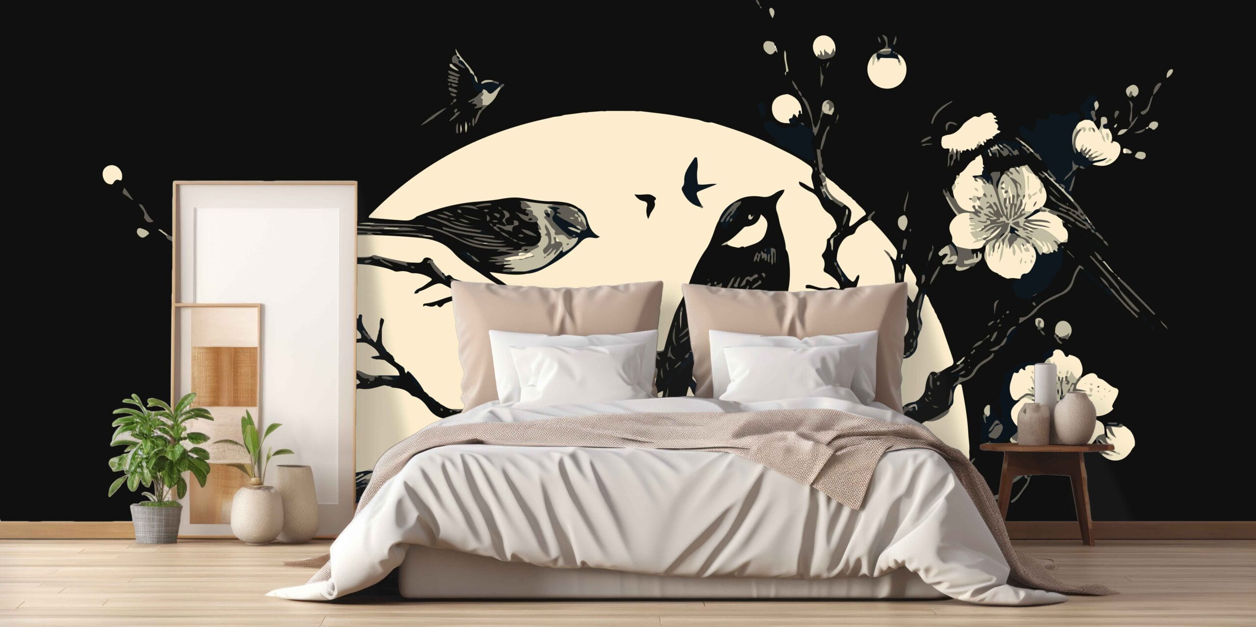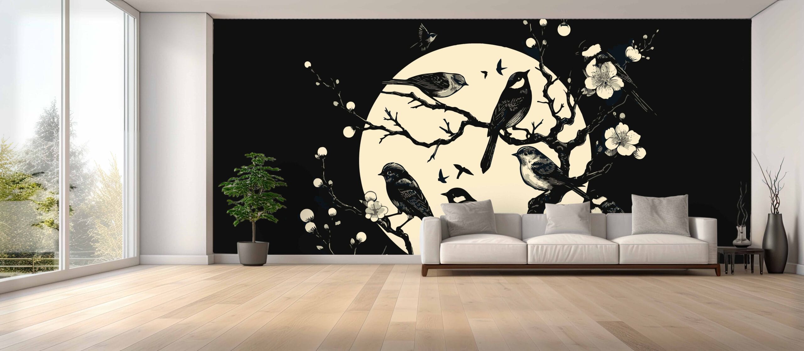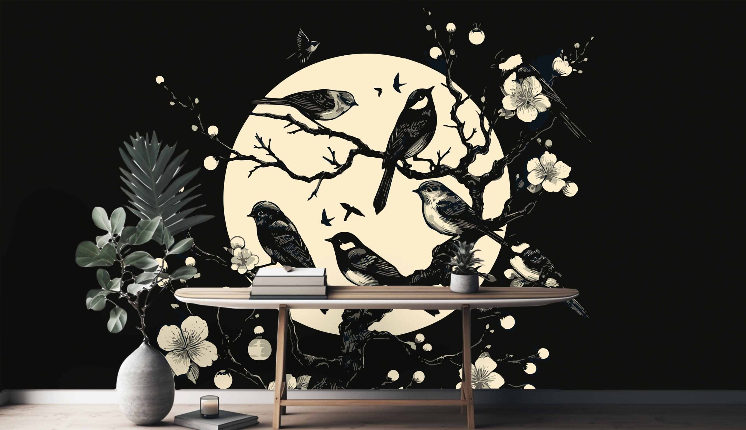 Tapeta Noćna Simfonija donosi hipnotizirajući spoj japanske estetike i suptilne dramatike. Ilustracija gracioznih ptica na granama, osvijetljenih svjetlom punog mjeseca, stvara jedinstvenu atmosferu tajanstvenosti i mira. Ovaj dizajn savršen je za suvremene interijere, minimalističke prostore i sve ljubitelje japanske umjetnosti.