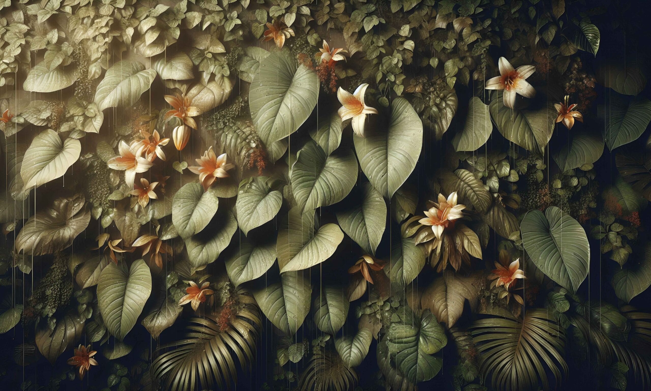 Boje: Tamnozelena, zlatnožuta, topli tonoviMotiv: Gusto lišće i cvjetovi s efektom svjetlosnih refleksija