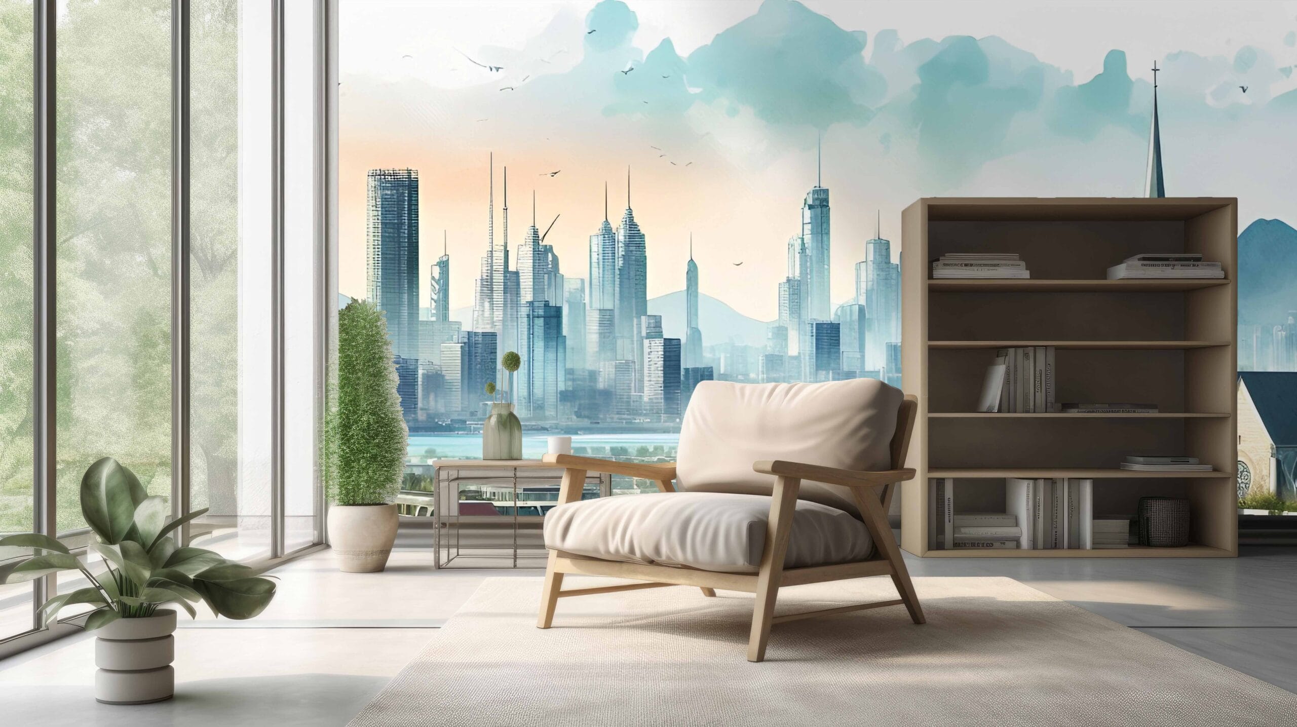 S profinjenim prijelazima boja u nijansama plave i sive, ova tapeta savršeno se uklapa u moderno uređene prostore, poput dnevnih boravaka, ureda ili poslovnih prostora. Njena prozračna i vizualno duboka kompozicija unosi osjećaj prostranosti, dok nježna akvarelna obrada dodaje notu umjetničke sofisticiranosti.