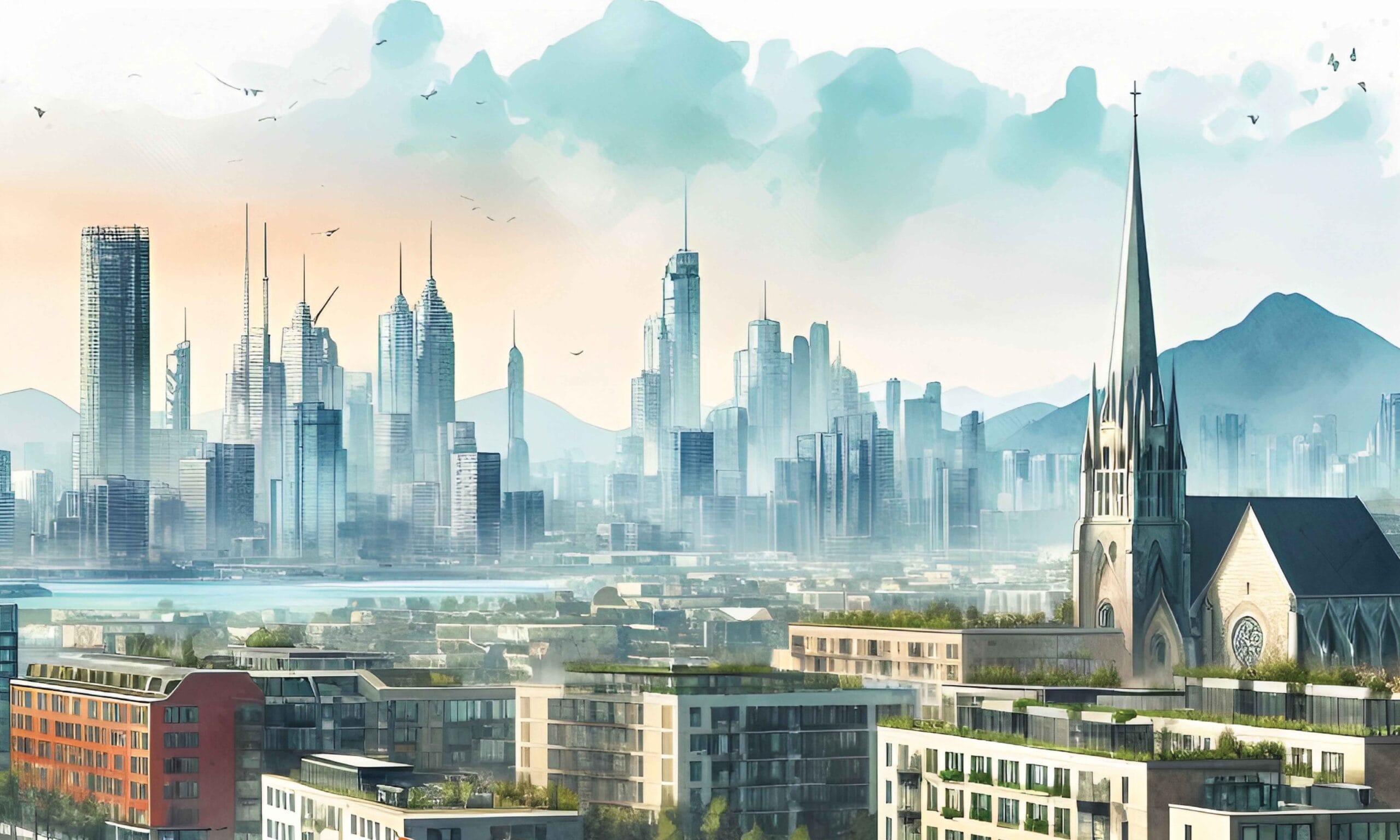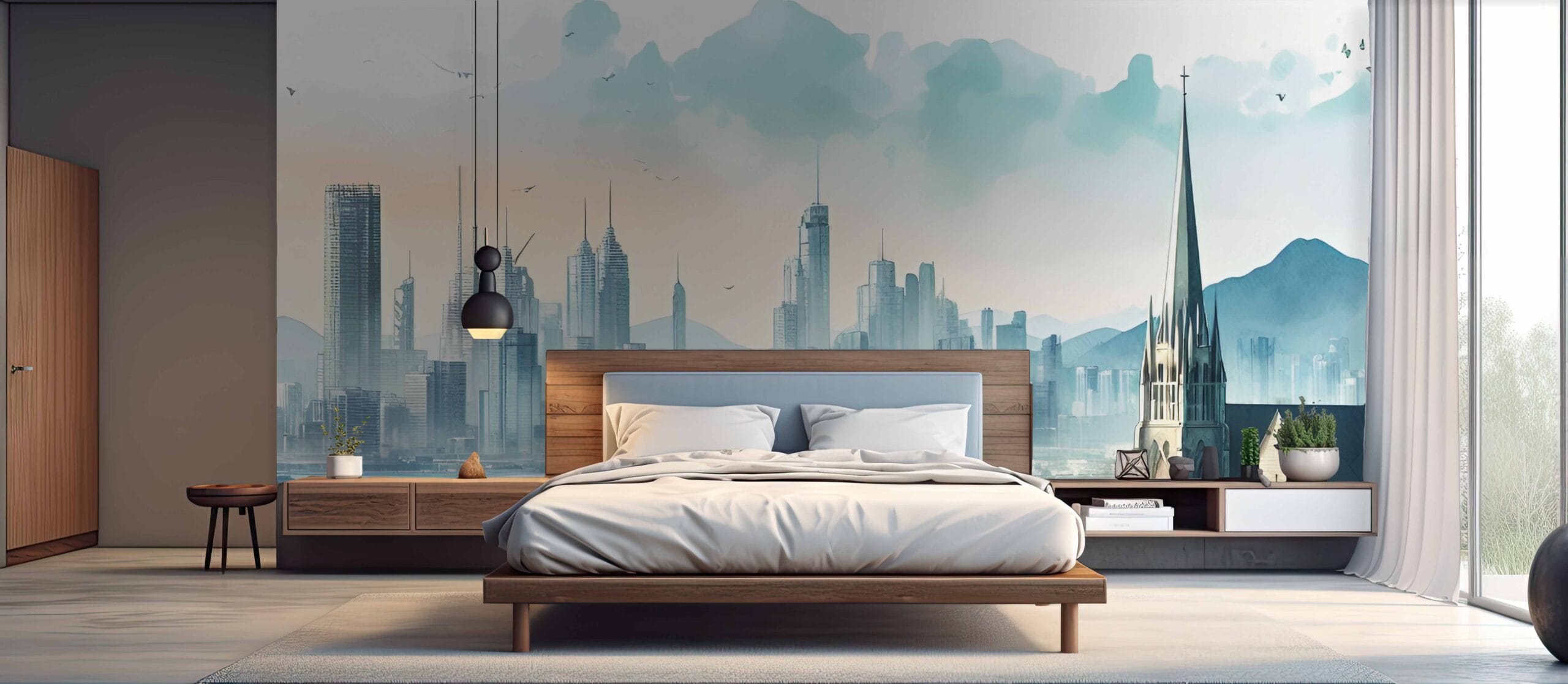Zidna tapeta Panoramski Grad donosi u vaš interijer energiju i eleganciju modernog urbanog krajolika. Ova detaljno ilustrirana tapeta prikazuje panoramu futurističkog grada s visokim neboderima, svjetlosnim refleksijama i klasičnim arhitektonskim elementima poput crkvenog tornja, stvarajući skladan kontrast između prošlosti i budućnosti.