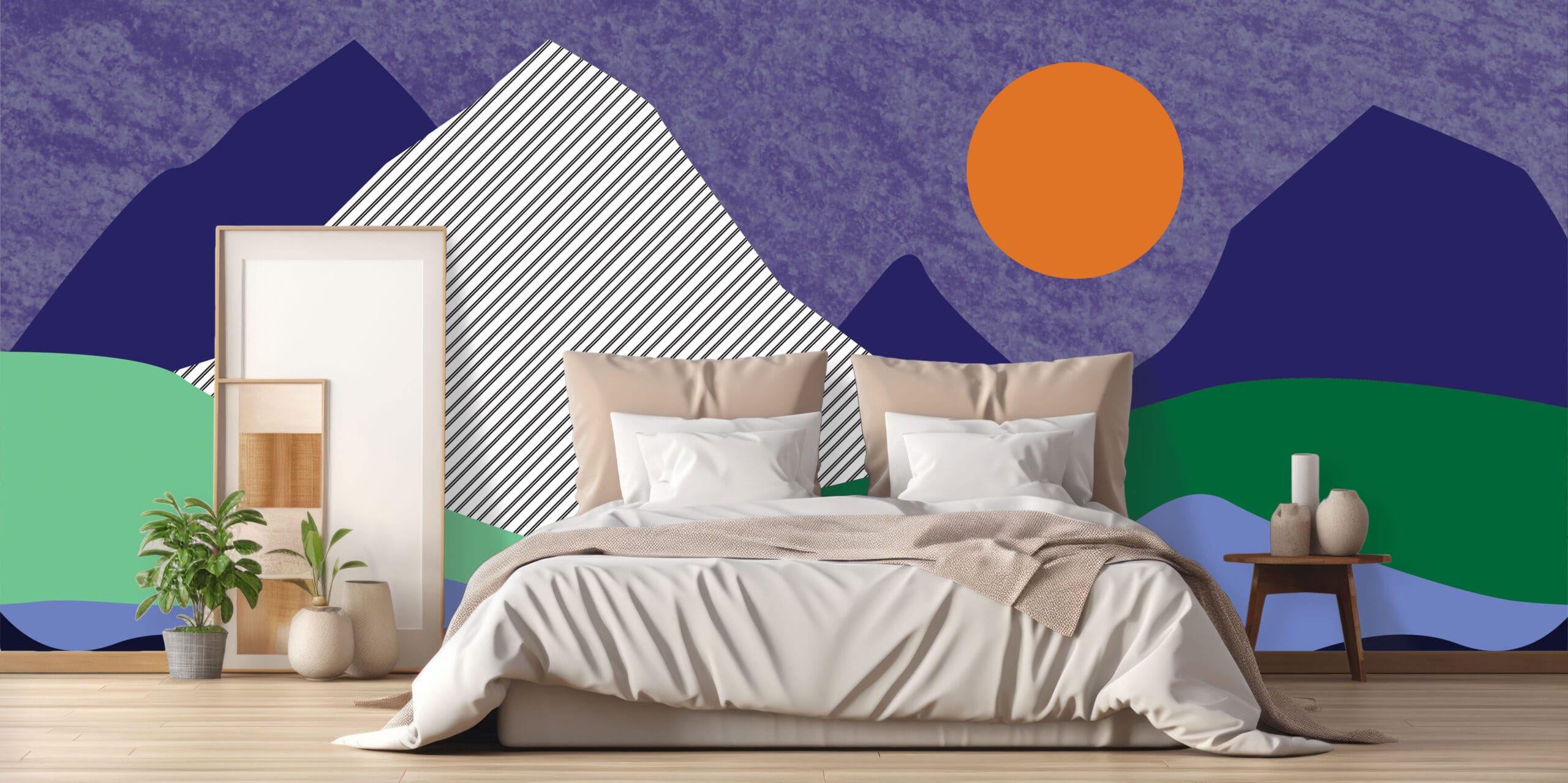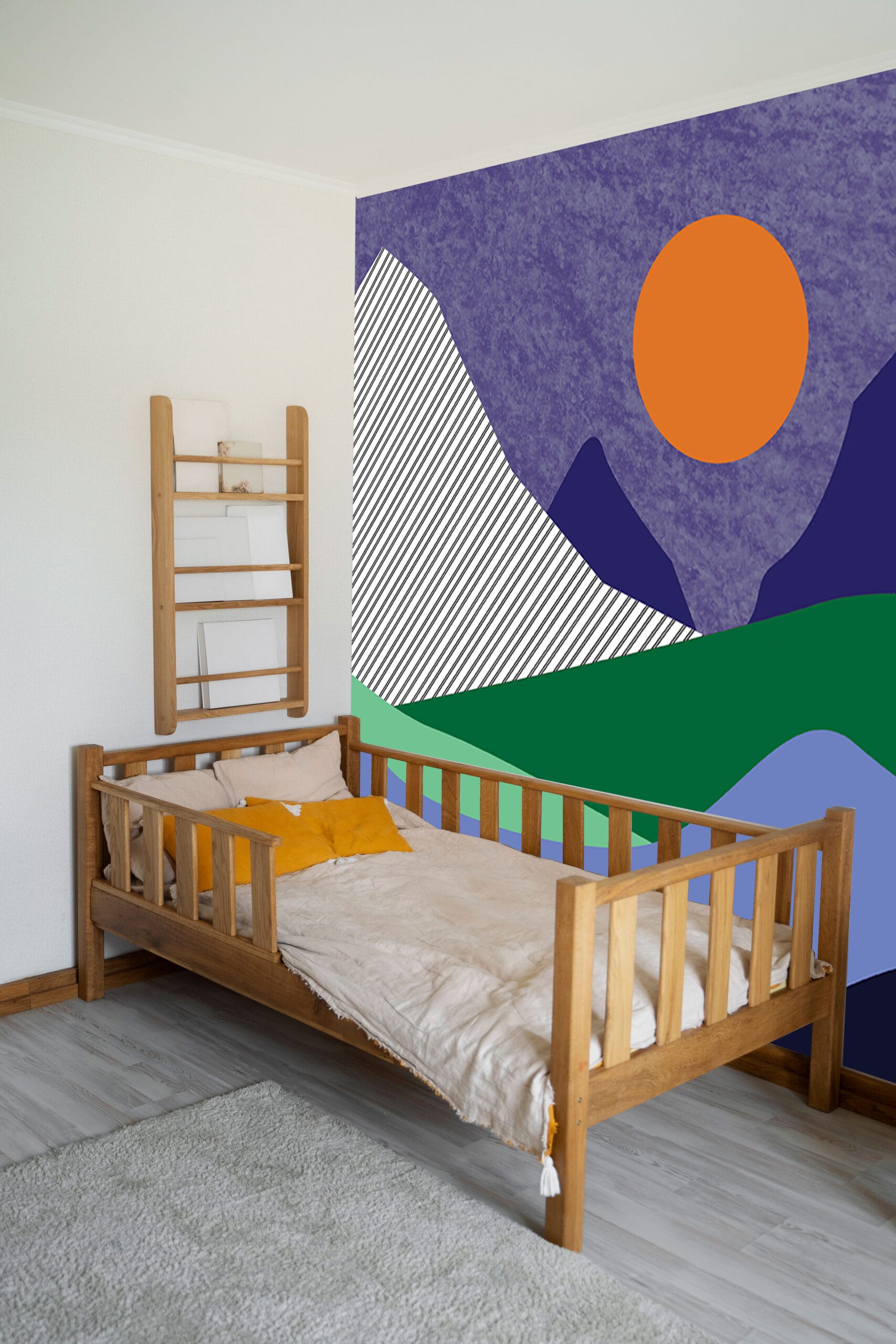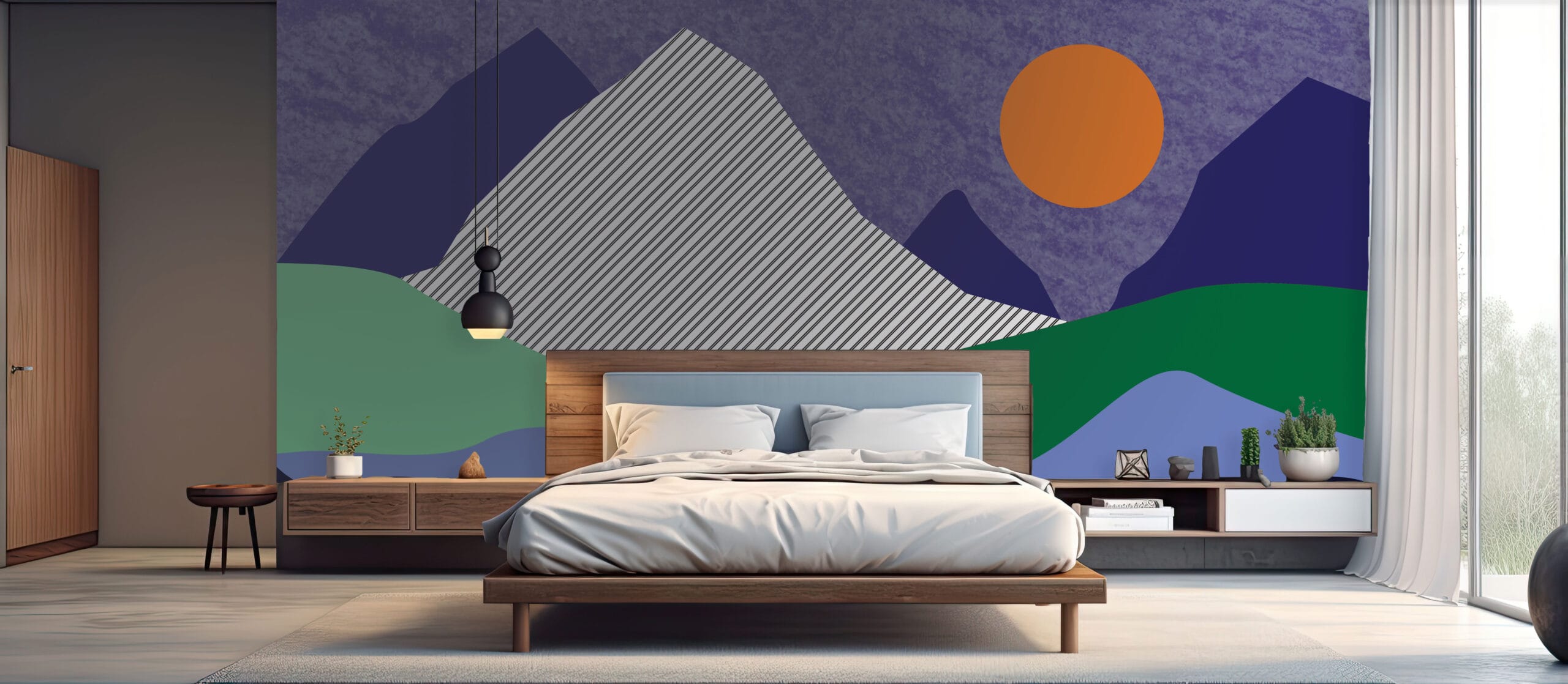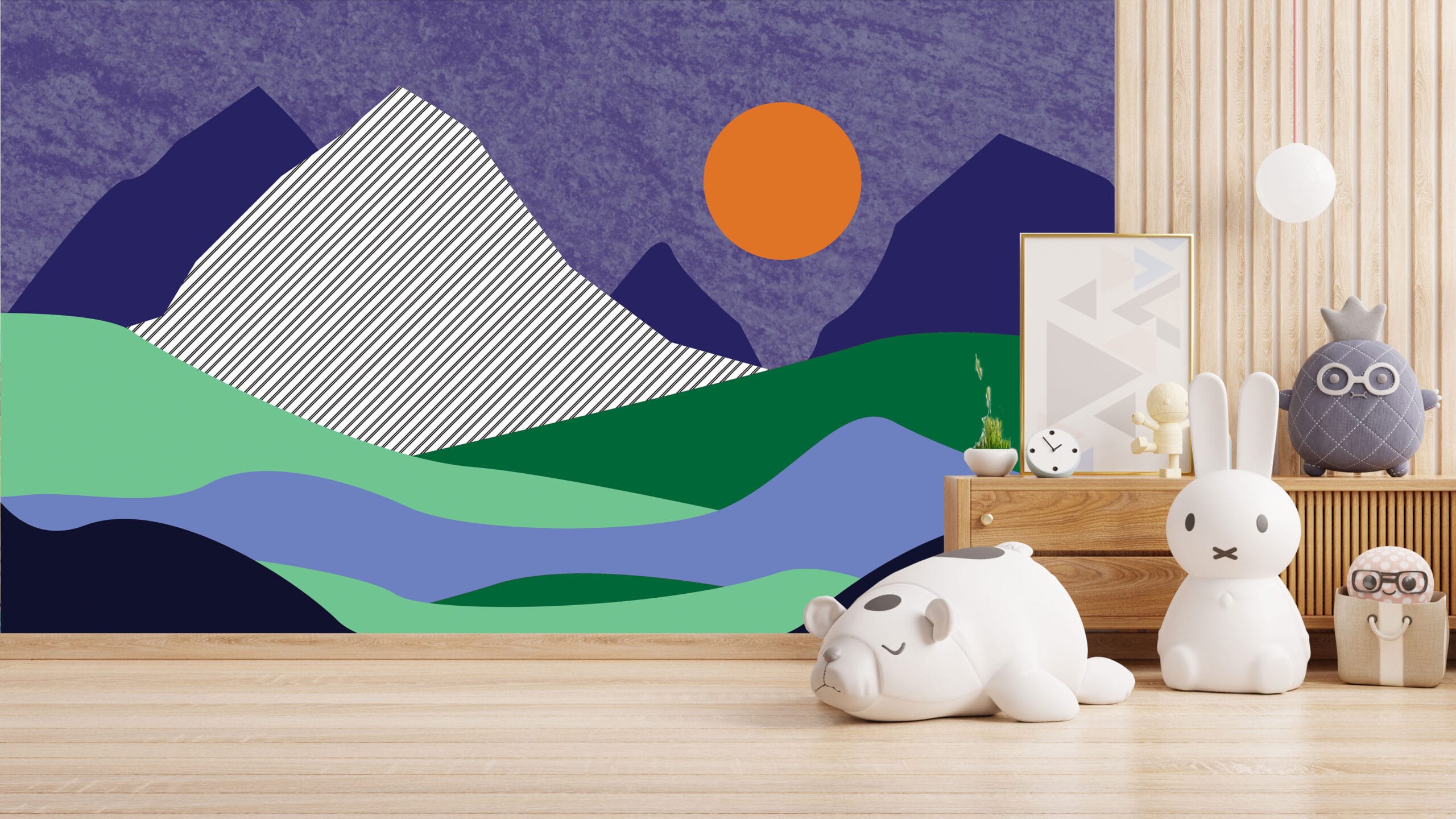 Tapeta Planinski Mir unosi suvremenu estetiku i umirujuću atmosferu u vaš dom. Moderni prikaz planinskog pejzaža s upečatljivim narančastim suncem i geometrijskim oblicima stvara vizualno dinamičan, a istovremeno spokojan prostor, idealan za dnevne boravke, radne sobe ili moderne dječje kutke.