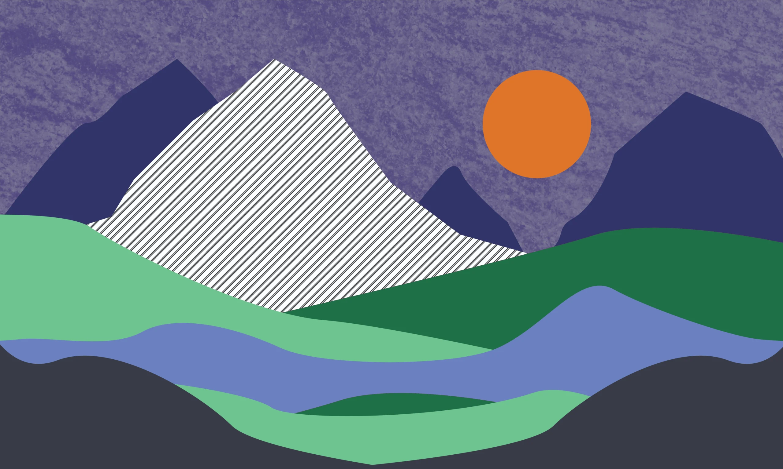 • Motiv: Stilozirane planine, sunce i brežuljci