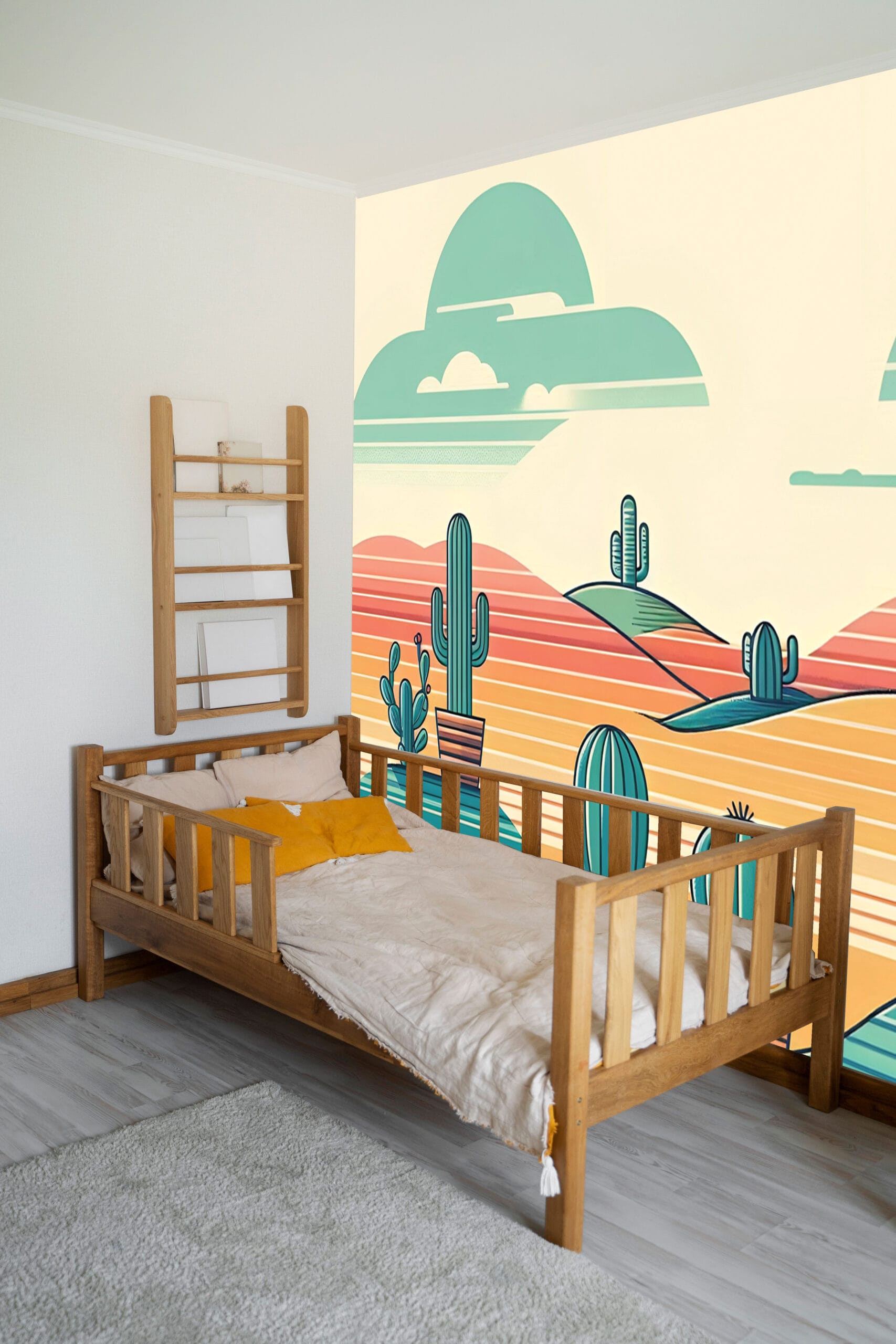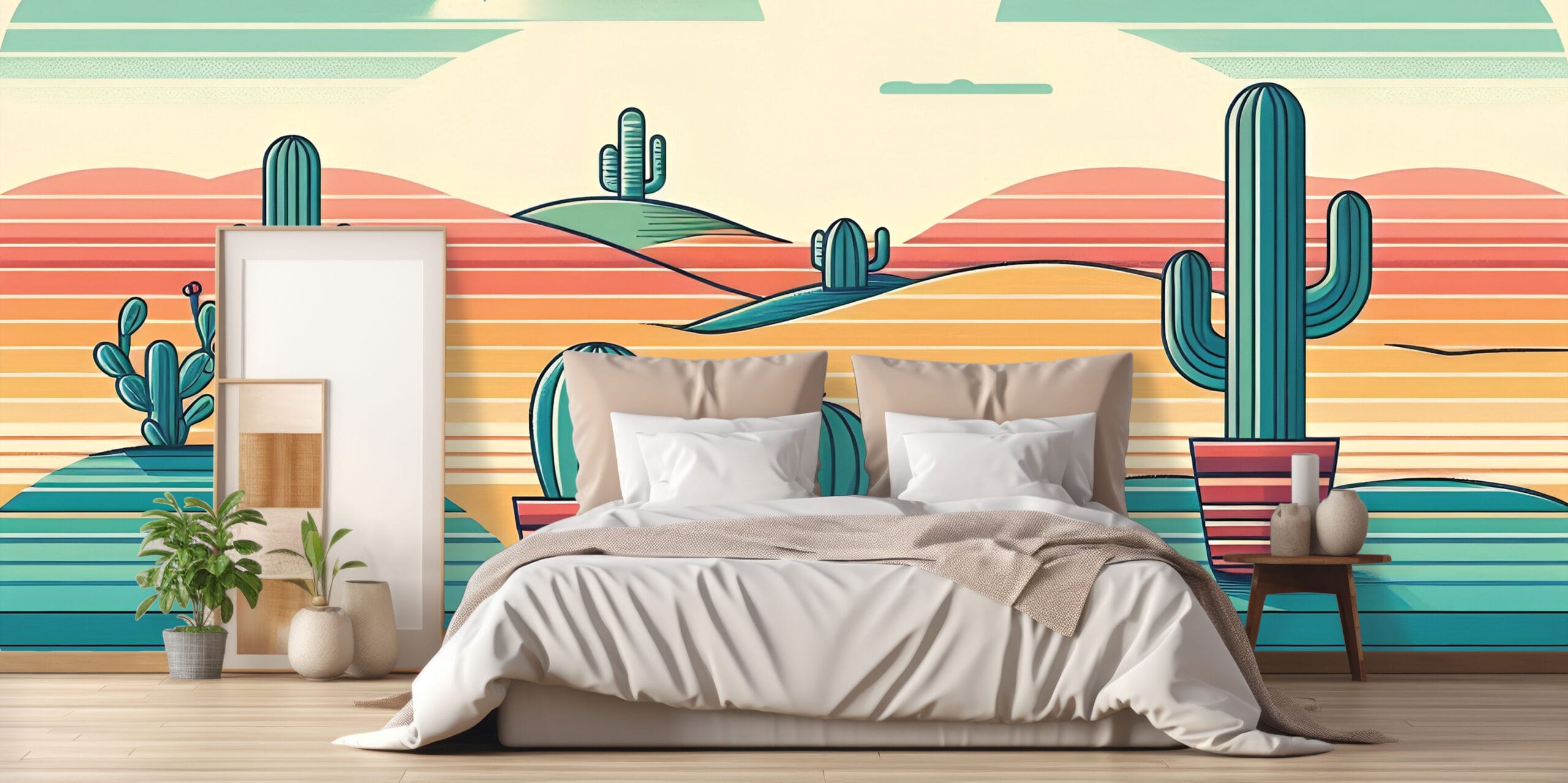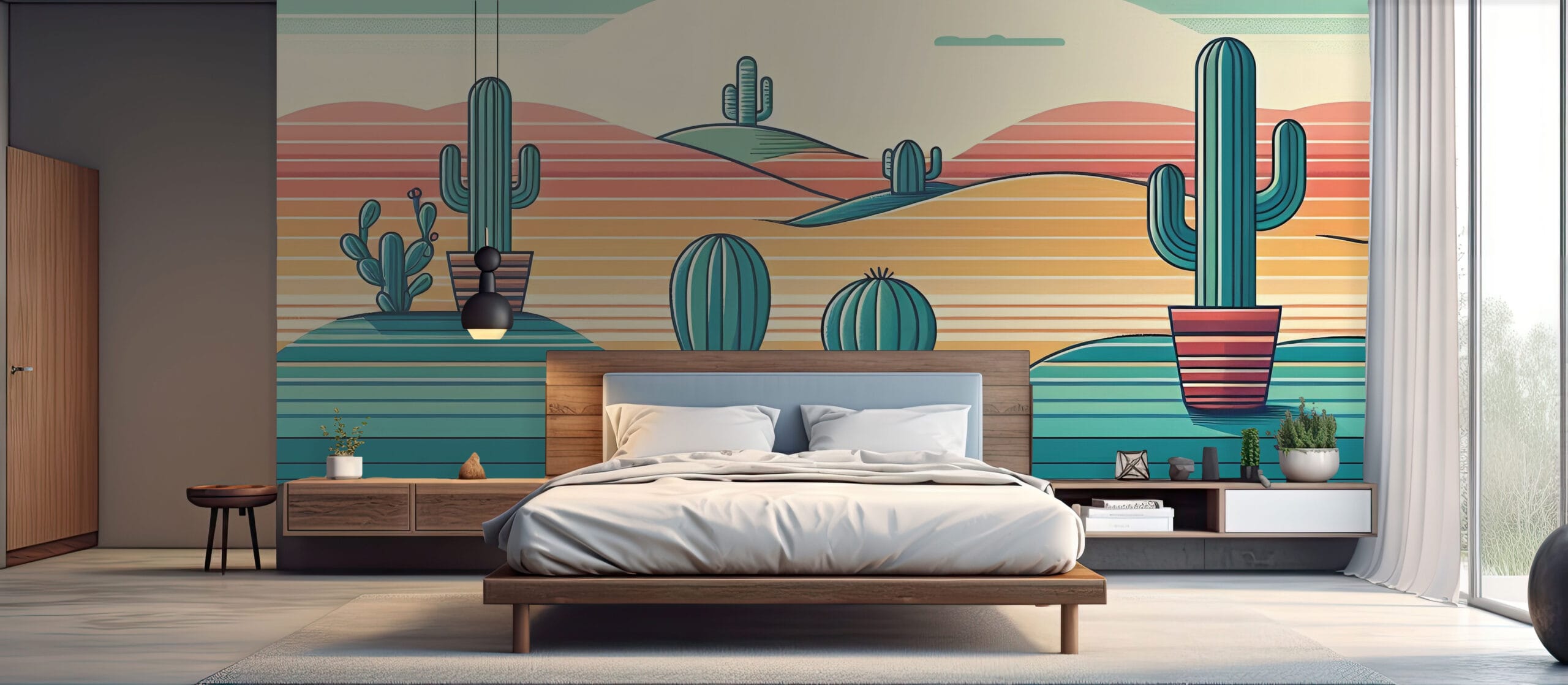 Tapeta Pustinjski San unosi toplinu i modernu estetiku u vaš prostor kroz stilizirani prikaz pustinjskog pejzaža. Geometrijski oblici kaktusa u prugastim posudama i slojeviti horizont u pastelnim tonovima stvaraju smirujuću, gotovo meditativnu atmosferu idealnu za dnevne boravke, urede ili moderne spavaće sobe.