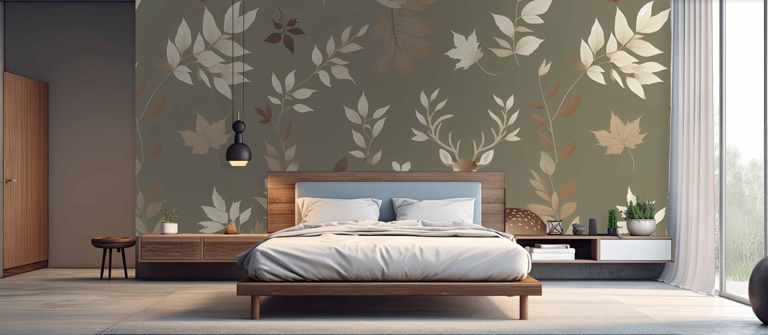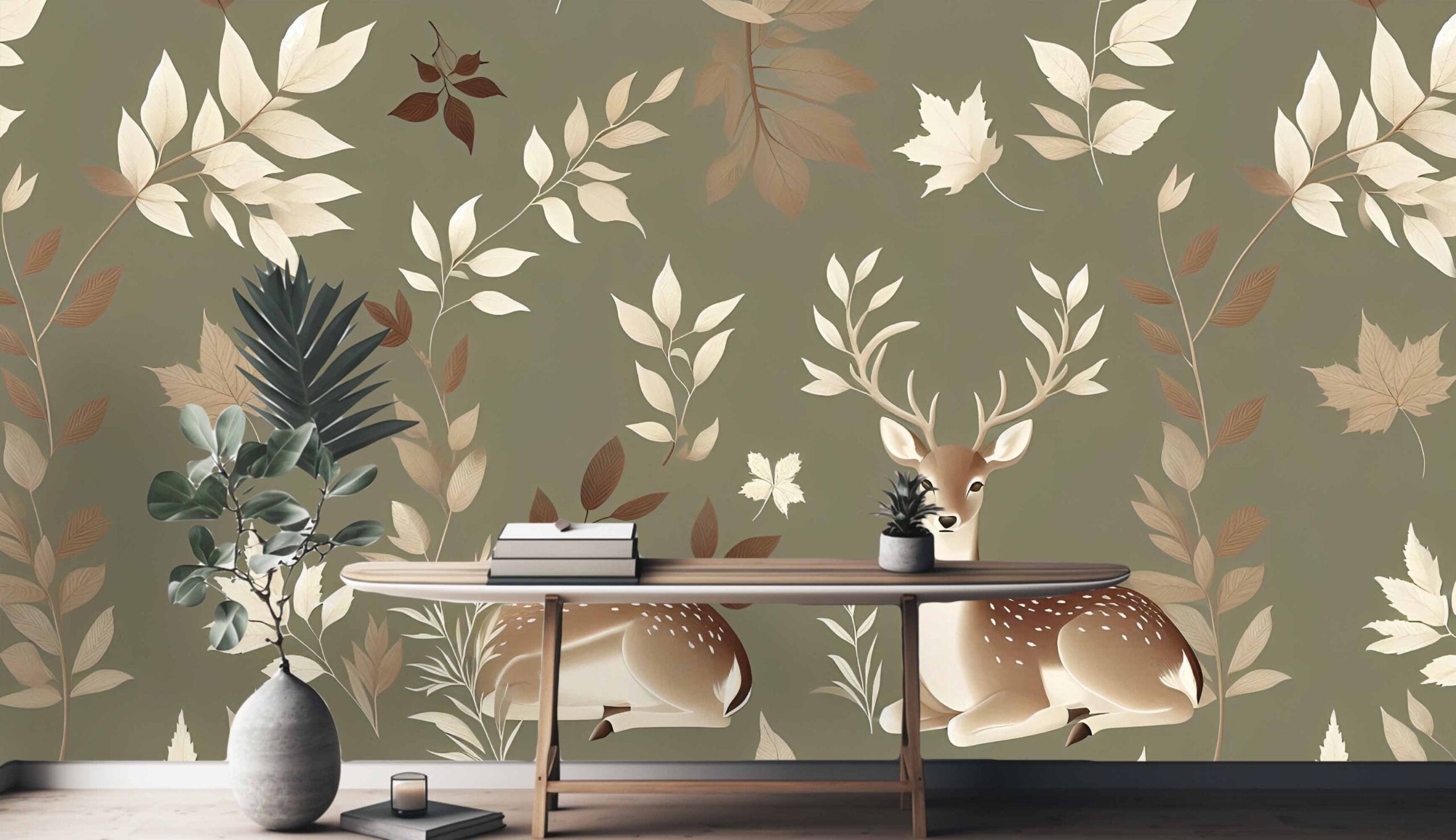 Tapeta Šumska Harmonija inspirirana je spokojem jesenske šume. Ilustracija gracioznog jelena okruženog lepršavim lišćem u toplim tonovima stvara umirujuću atmosferu, idealnu za spavaće sobe, dječje sobe ili prostore za opuštanje.