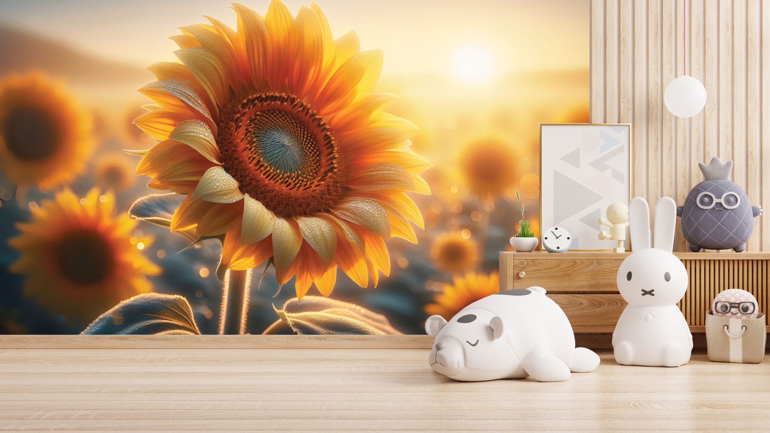 Tapeta Sunčev Zagrljaj unosi energiju zlatnog sata i ljepotu prirode direktno na vaš zid. Detaljan prikaz raskošnog suncokreta okupanog prvim zrakama sunca stvara atmosferu topline, optimizma i mira. Ova tapeta je savršen izbor za prostore u kojima želite postići osjećaj vedrine i vizualno otvoriti prostoriju prirodnim sjajem.