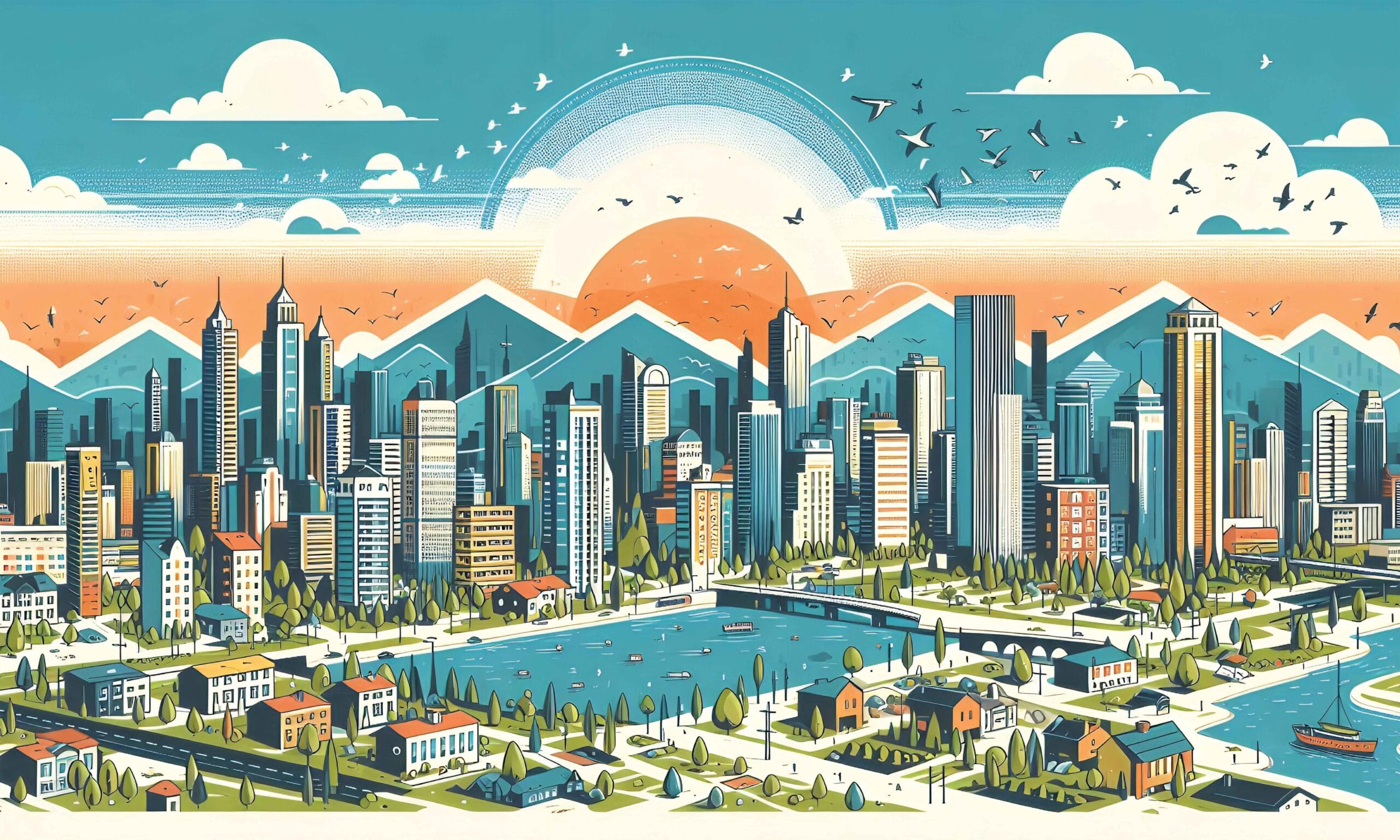 Tapeta Urbanistička Simfonija donosi dinamičan pogled na urbani pejzaž s visokim neboderima, planinama u pozadini i sunčevim zrakama koje obasjavaju grad. Ova ilustracija u retro-geometrijskom stilu kombinira žive boje i precizne linije, stvarajući vizualni spektakl koji unosi dozu moderne umjetnosti u svaki interijer.