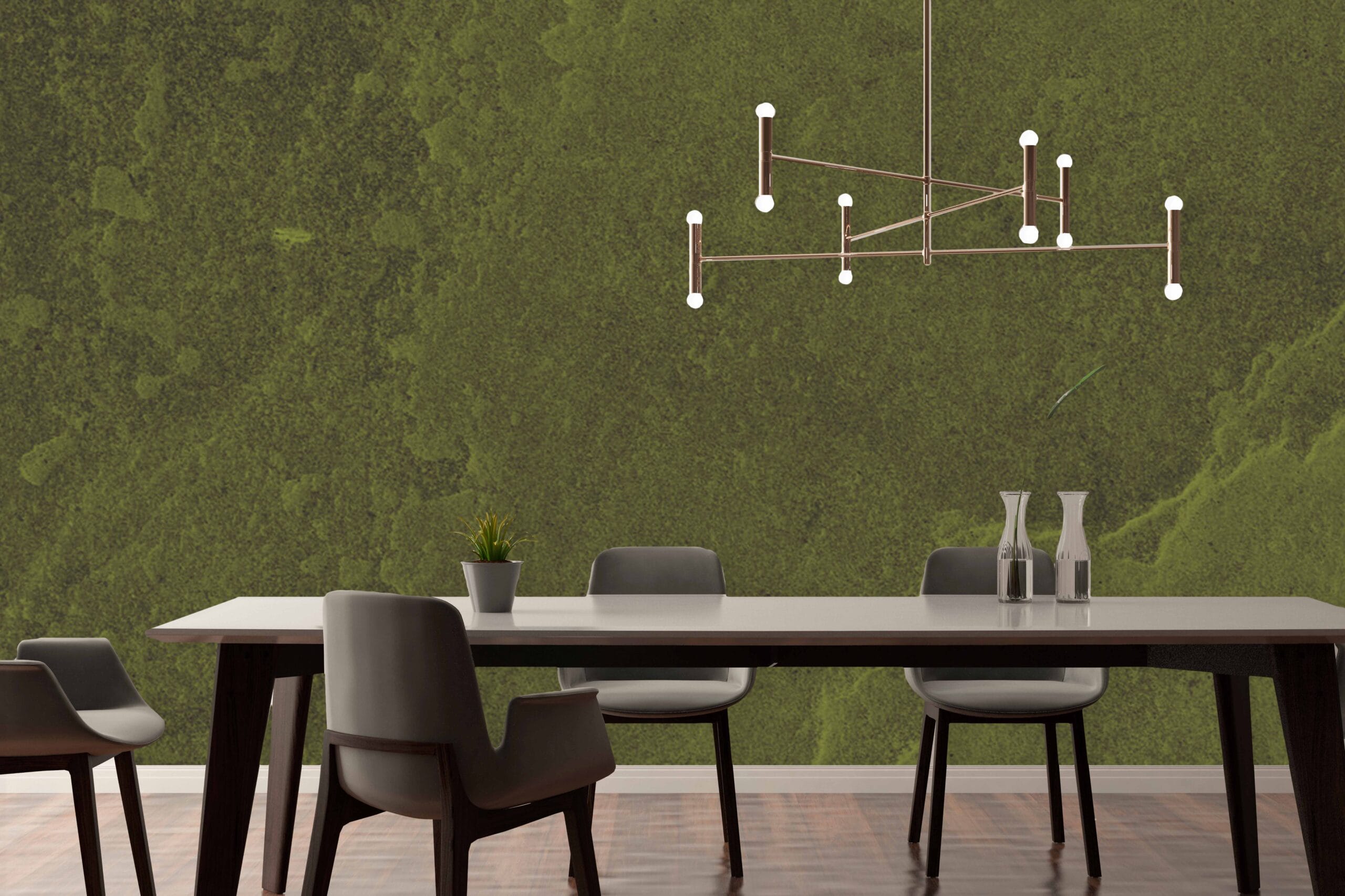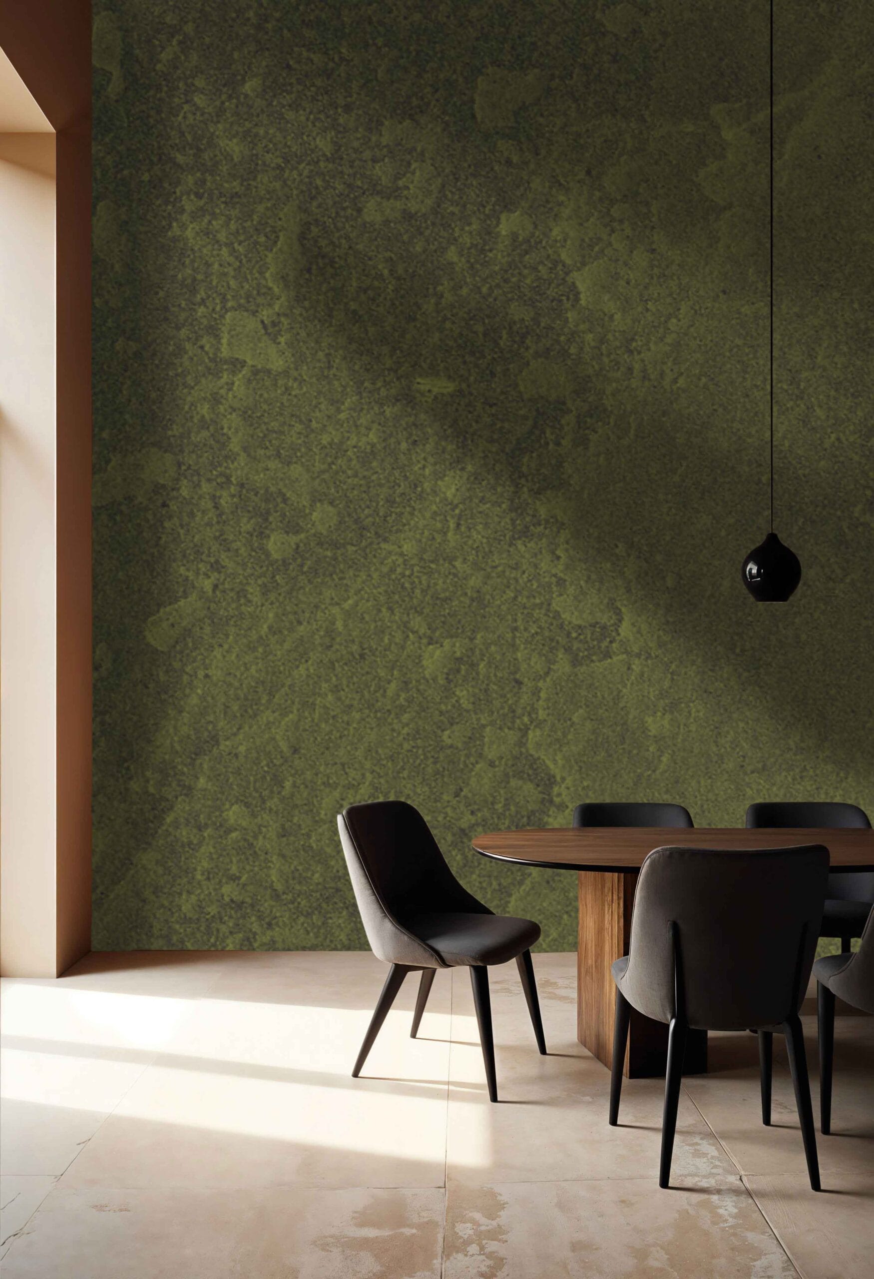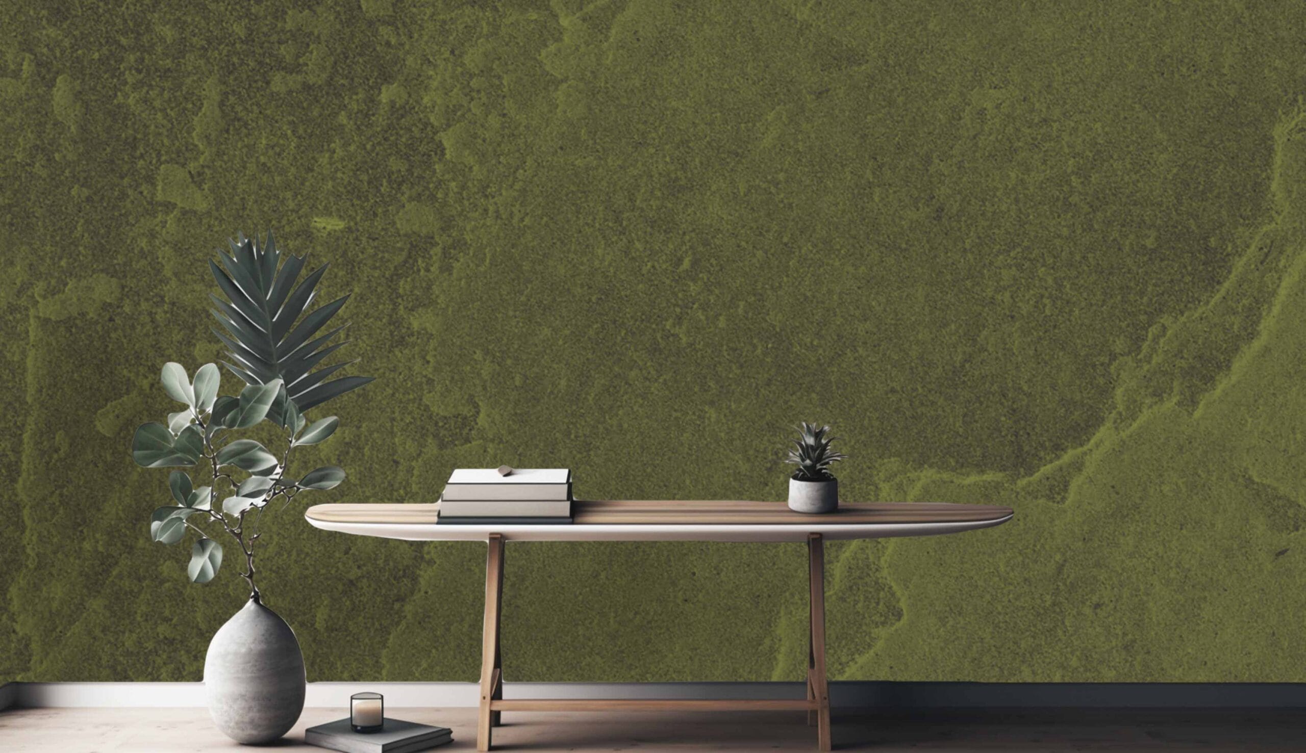 Tapeta Zelena Patina unosi u interijer efekt prirodnog starenja materijala, stvarajući dojam autentične, oksidirane površine. Njena bogata zelena tekstura podsjeća na stare metalne ploče ili betonske zidove prekrivene mahovinom, donoseći osjećaj povezanosti s prirodom i nepatvorenim materijalima.