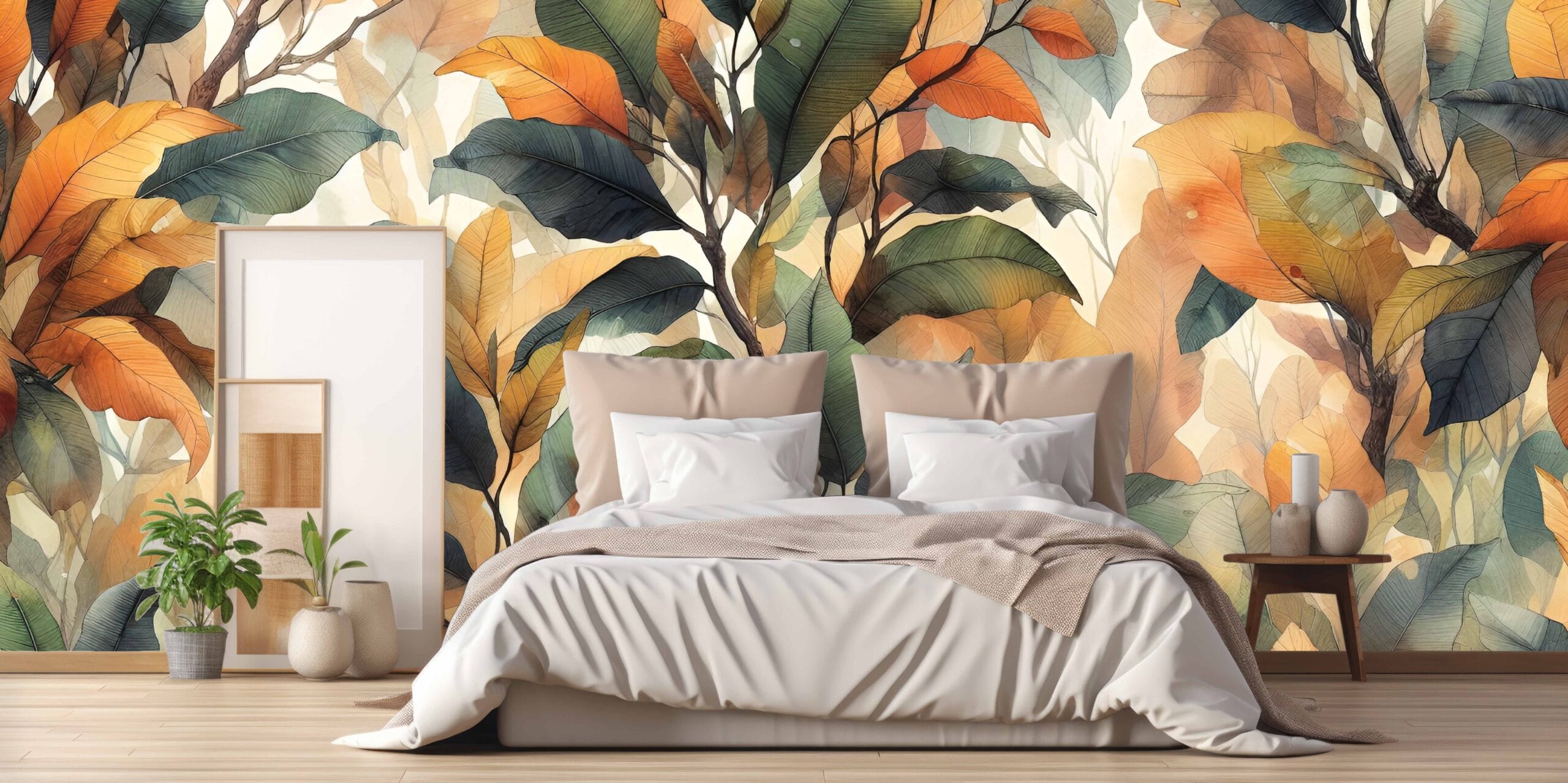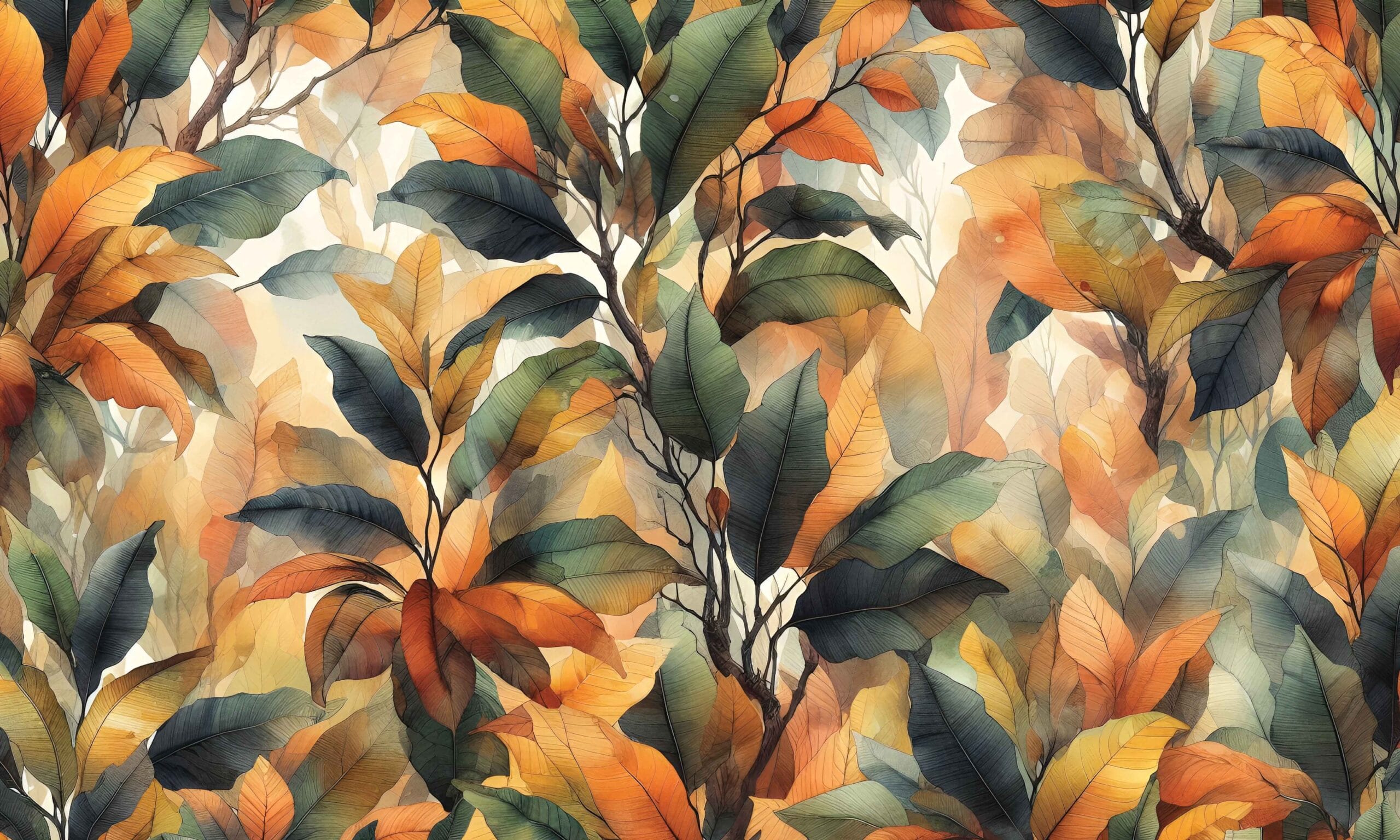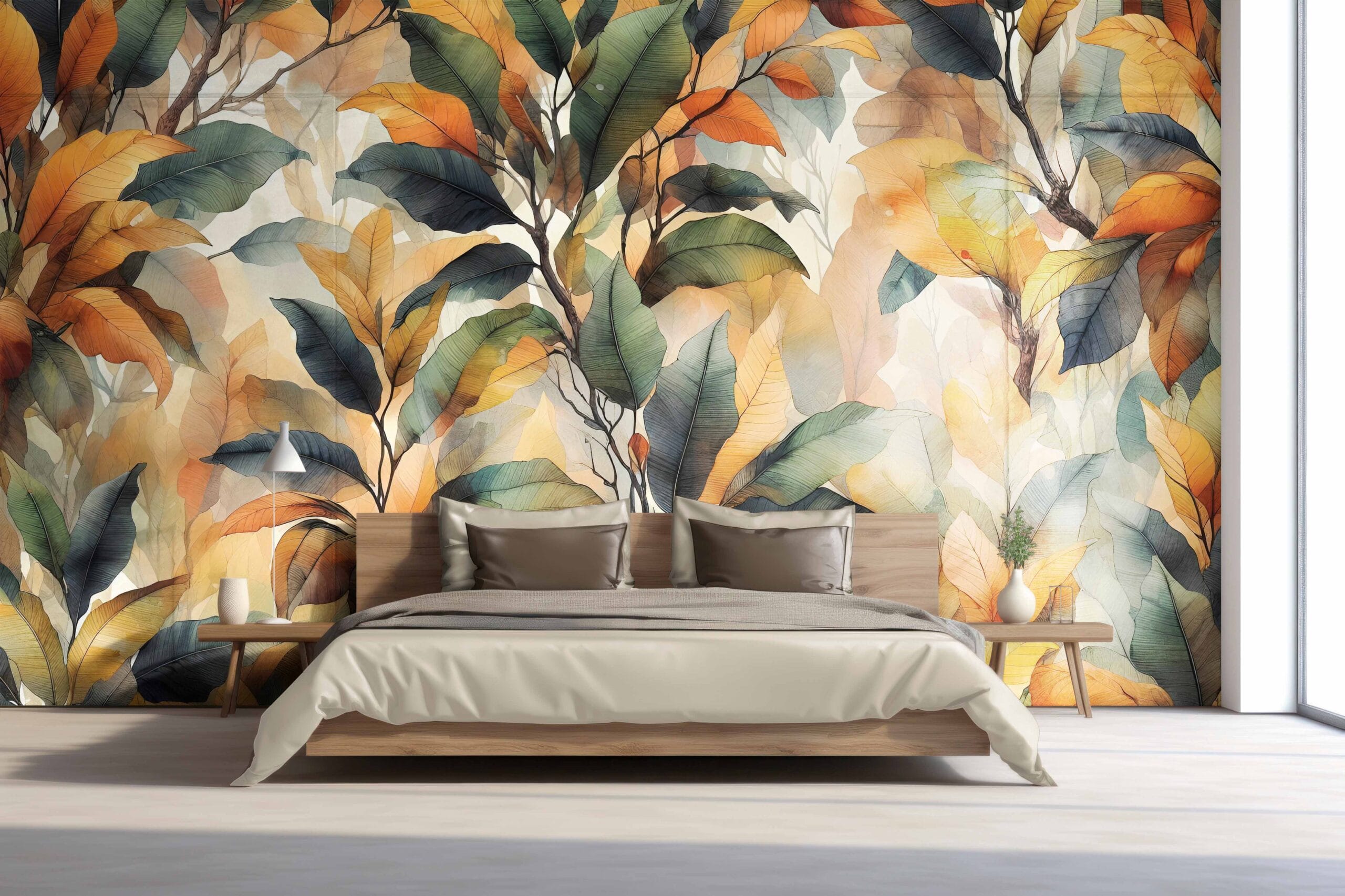 - Motiv: Veliki, akvarelni listovi u prirodnim nijansama