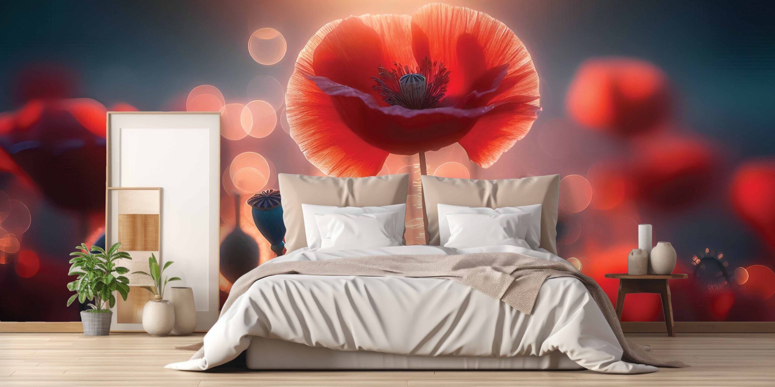 Idealna za spavaće sobe, dnevne boravke ili meditativne prostore, Zlatni Mak donosi toplinu, sofisticiranost i dašak prirodne elegancije. Svjetlucavi bokeh efekt u pozadini dodatno naglašava mističnost ovog umjetničkog prikaza.