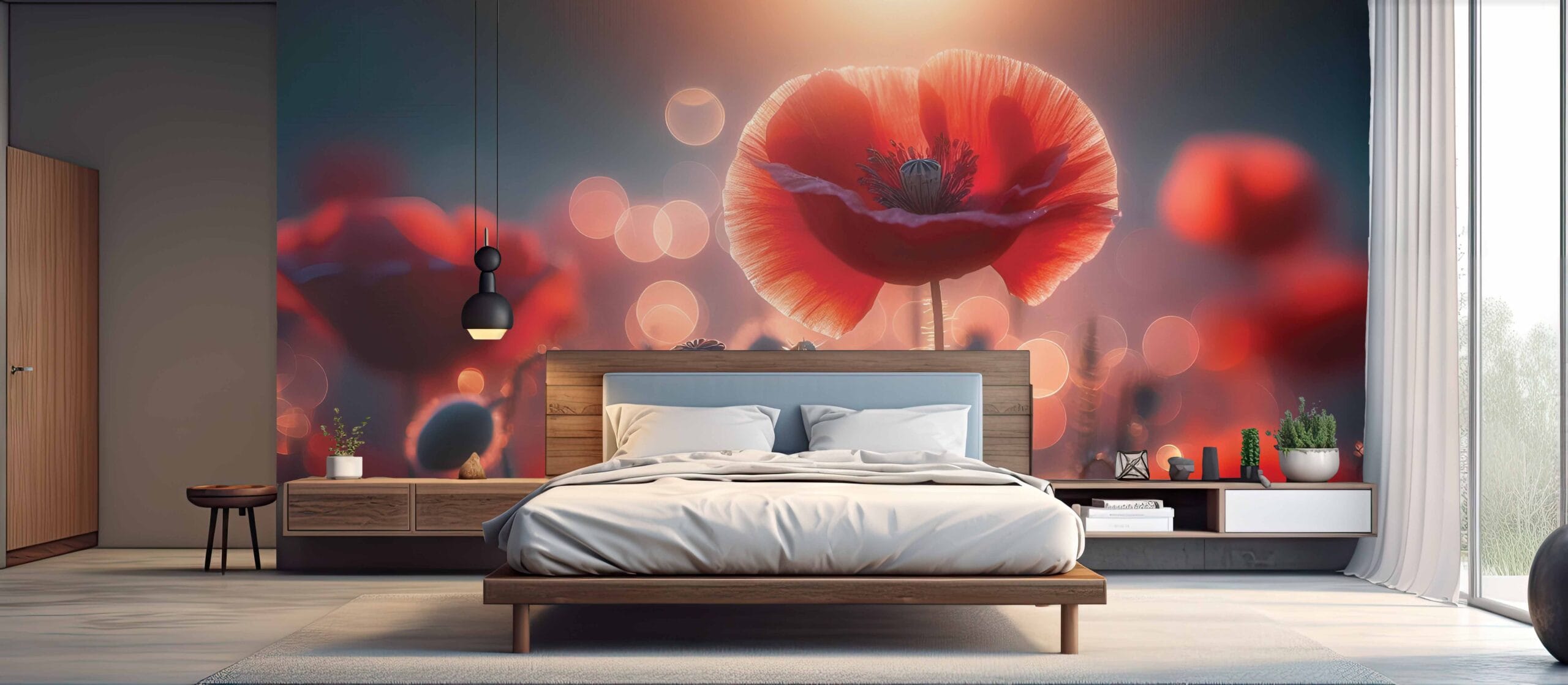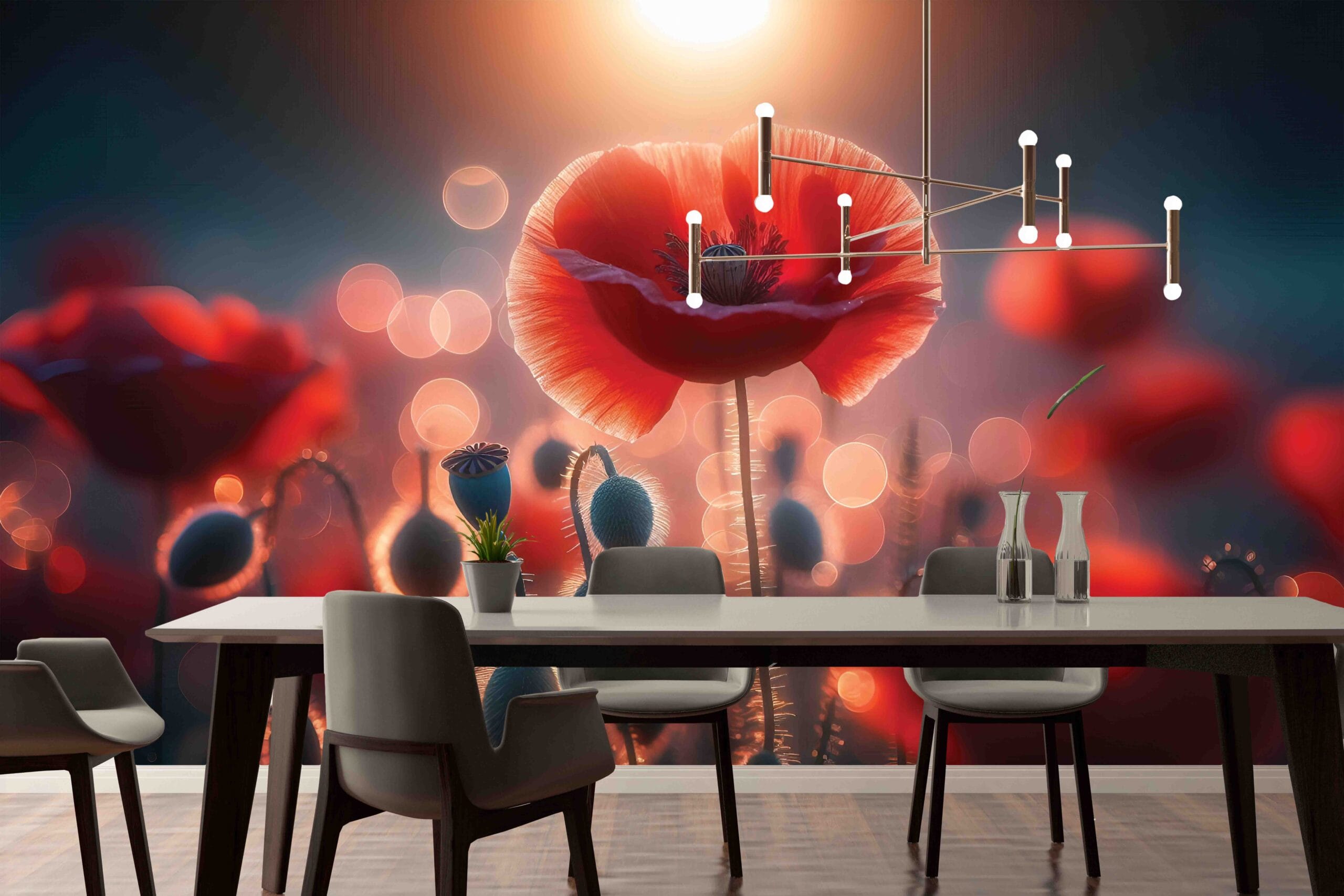 Transformirajte svoj prostor s elegantnom i inspirativnom tapetom Zlatni Mak. Ovaj dizajn hvata ljepotu crvenog maka obasjanog zlatnim svjetlosnim efektima, stvarajući čaroban i sanjiv ambijent.